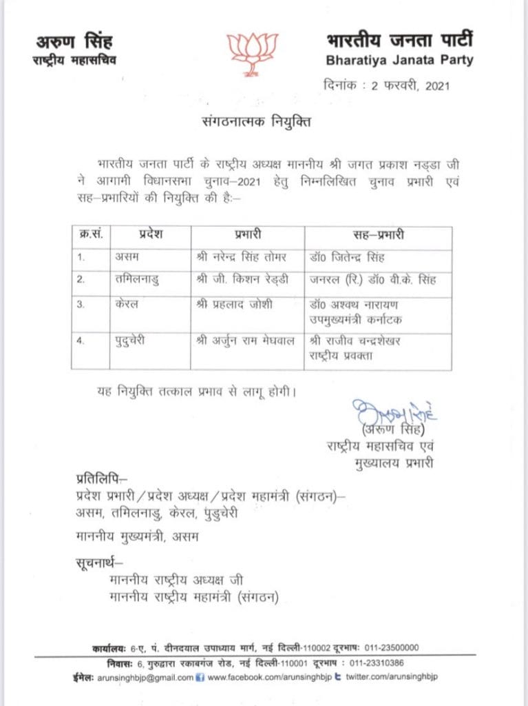 तमिलनाडु के लिए जी किशन रेड्डी, केरल के लिए प्रह्लाद जोशी, पुडुचेरी के लिए अर्जुन राम मेघवाल को पार्टी प्रभारी नियुक्त किया गया है। बीजेपी ने आगामी विधानसभा चुनावों को ध्यान में रखते हुए चुनाव प्रभारी नियुक्त किए हैं| इन राज्यों में अप्रैल-मई में विधानसभा चुनाव होने हैं, जिसके चलते पार्टी शीर्ष नेताओं को इन राज्यों की जिम्मेदारी सौंपी है| पश्चिम बंगाल में पहले से ही भाजपा महासचिव कैलाश विजयवर्गीय के पास चुनाव प्रभार है|