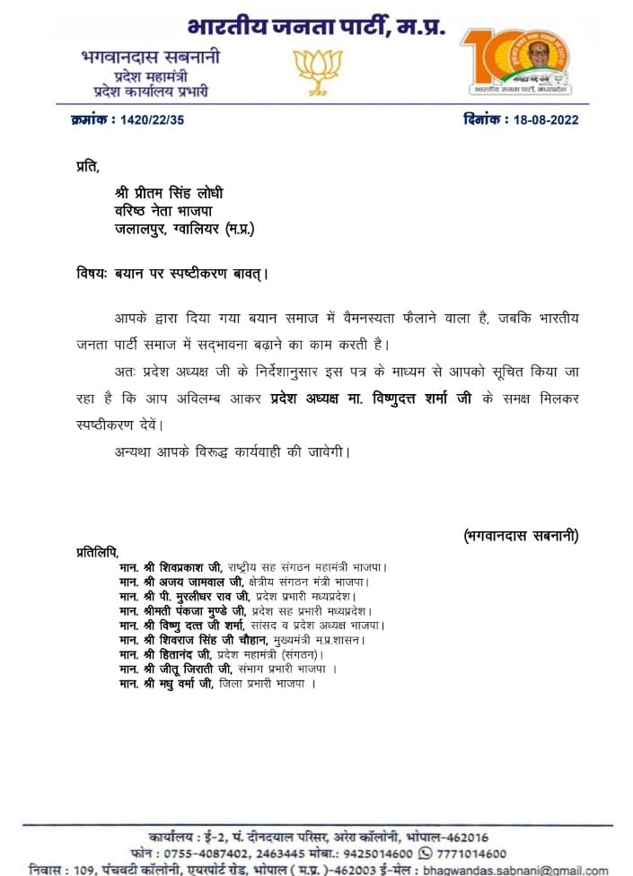 भोपाल, डेस्क रिपोर्ट। भाजपा नेता प्रीतम लोधी (Pritam lodhi) की ब्राह्मणों के खिलाफ की गई अपमानजनक टिप्पणी का मामला तूल पकड़ रहा है। इसे लेकर भाजपा संगठन सख्त हो गया है और प्रदेश अध्यक्ष विष्णु दत्त शर्मा के निर्देश पर कार्यालय प्रभारी भगवानदास सबनानी ने प्रीतम लोधी को भोपाल तलब किया है। वहीं इस बयान को लेकर ब्राह्मण समाज में रोष है। आज ब्राह्मण समाज एवं सर्व समाज शाम 4 बजे ग्वालियर में पुलिस अधीक्षक कार्यालय जाकर प्रीतम लोधी पर कठोर कार्रवाई की मांग करने जा रहे हैं। इसी के साथ उन्होने चेतावनी दी है कि अगर प्रशासन कार्यवाही करने में हीलाहवाली करता है तो वो बड़े स्तर पर आंदोलन करेंगे। वहीं इस मामले में कांग्रेस भी लोधी के खिलाफ हमलावर हो गई है।
