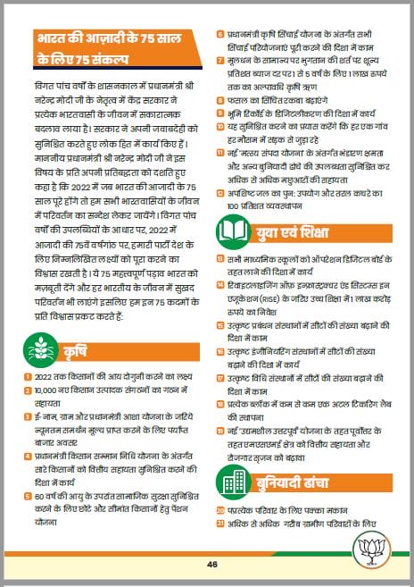 गृहमंत्री राजनाथ सिंह ने कहा 2022 तक नए भारत का निर्माण करने की प्रतिबद्धता पर कायम हैं और इसके लिए 75 कदम तय किए हैं। इसमें सिचाई योजनाओं को पूरा करना, किसानों को जीरो ब्याज पर 1 लाख लोन, किसानों और व्यापारियों के लिए पेंशन, युवाओं और छात्रों के लिए भी कई कदम उठाए जाएंगे। एक्सिलेंट इंजीनियरिंग संस्थाओं में सीटे बढ़ाएंगे। लॉ कॉलेज में भी सीटें बढ़ाएंगे। बुनयादी ढांचे के तहत हर परिवार को पक्का मकान, सभी गरीब परिवारों के एलपीजी सिलेंडर, हर घर तक बिजली, नेशनल हाईवेज की लंबाई दोगुना करेंगे, रेलवे में 2022 तक सभी पटरियों को ब्रॉडगेज में परिवर्तन का प्रयास रहेगा, स्वास्थ्य के मामले में आयुष्मान भारत के तहत काम किए जाएंगे, गरीबों के लिए उनके घर अच्छी स्वास्थ्य सुविधाएं पहुंचाई जाएगी, कुपोषण के खिलाफ कदम उठाए जाएंगे। ईज ऑफ डुइंग बिजनेस को और बेहतर बनाने का काम करेंगे, निर्यात को दोगुना करने का प्रयास होगा, सूक्ष्म, मध्यम और लघु उद्योगों के लिए सिंगल विंडो सिस्टम बनाएंगे।