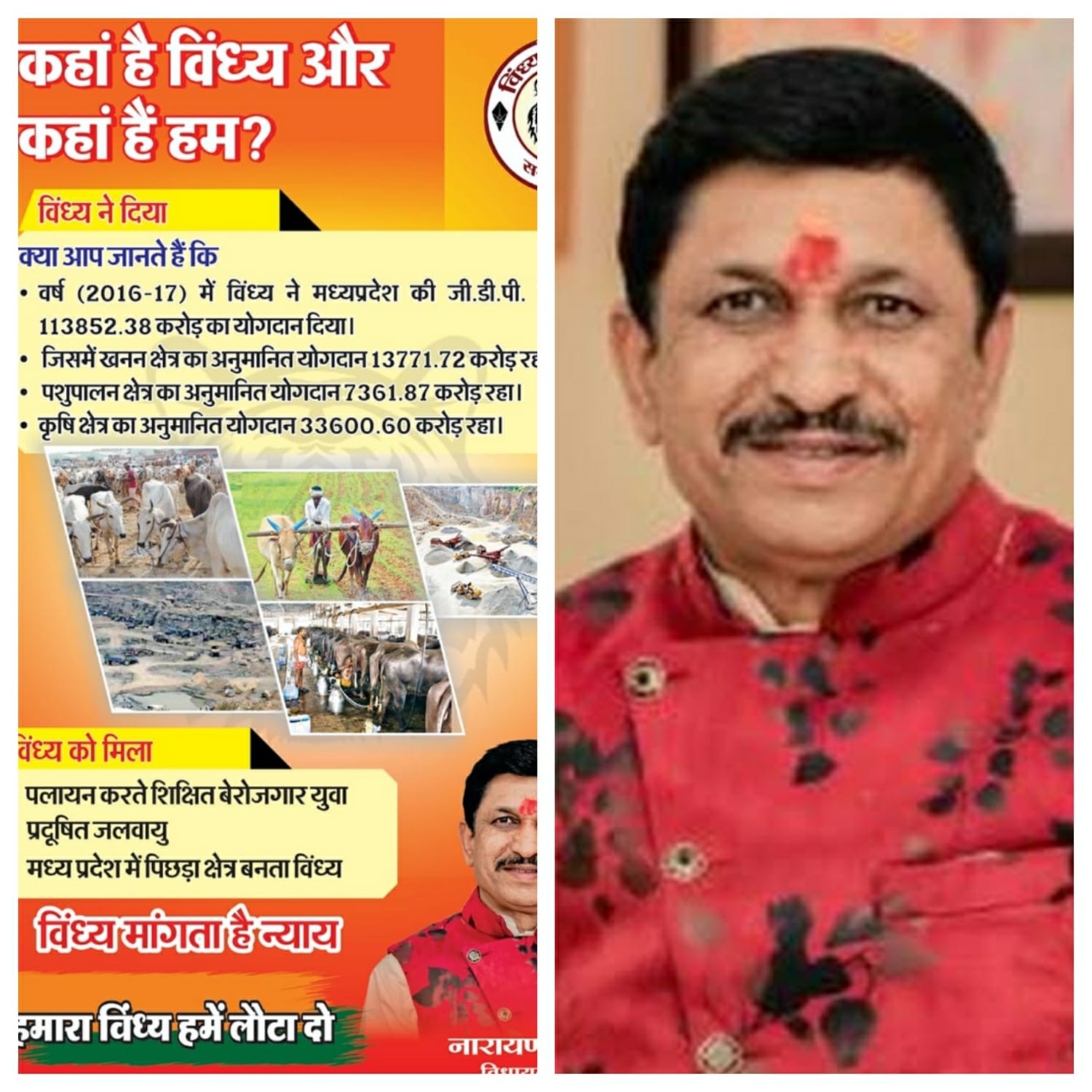 विंध्य को अलग प्रदेश बनाने की मांग कर रहे नारायण त्रिपाठी ने अब की बार ट्विटर पर अलग राज्य की मांग दोहराई है। उन्होंने कुछ आंकड़े देते हुए बताया है किस तरह से विंध्य ने मध्यप्रदेश में 2016-17 में प्रदेश की जीडीपी में अनुमानित 113852.38 करोड़ का योगदान दिया जिसमें खनन का अनुमानित योगदान 13771.72 करोड़, पशुपालन का अनुमानित योगदान 7361.87 करोड़ और कृषि क्षेत्र का अनुमानित योगदान 33600.60 करोड़ का रहा। नारायण त्रिपाठी ने आगे लिखा है कि विंध्य को इसके बदले पलायन करते शिक्षित बेरोजगार युवा, प्रदूषित जलवायु, मध्य प्रदेश में पिछड़ा क्षेत्र बनता विंध्य मिला। ट्वीटर में लिखा है “विंध्य मांगता है न्याय, हमारा विंध्य हमें लौटा दो” ट्वीटर में ऊपर विंध्य प्रदेश का मोनो भी बना है जिसमें एक शेर है।