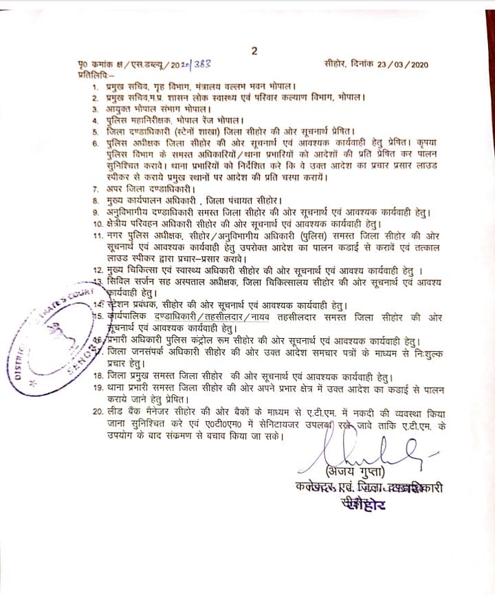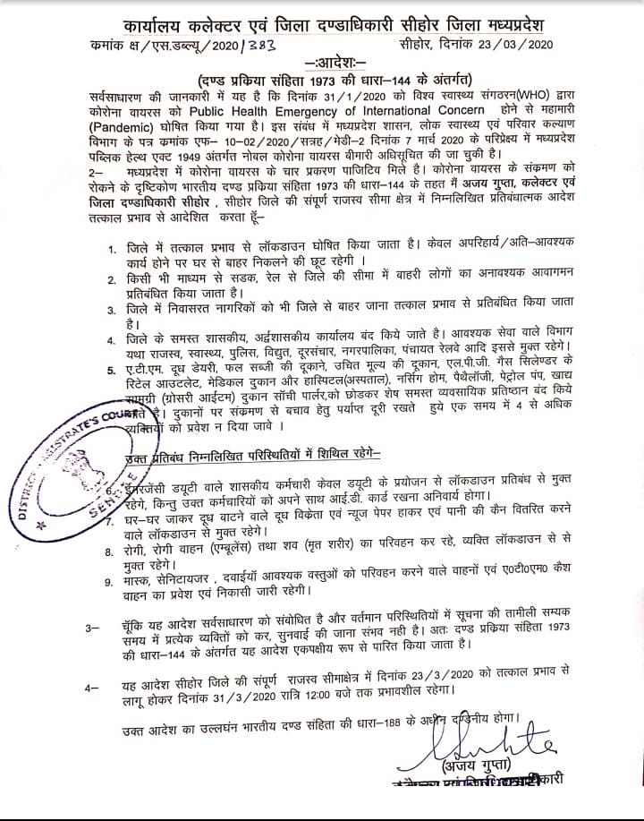 सीहोर। अनुराग शर्मा। सीहोर कलेक्टर अजय गुप्ता एवं पुलिस अधीक्षक एसएस चौहान एडिशनल एसपी समीर यादव ने सोमवार 23 मार्च को सायं जिले में दण्ड प्रक्रिया संहिता की धारा 144 के अंतर्गत प्रभावशील किए गए लॉक-डाउन की समीक्षा की। इस दौरान उन्होंने निर्देश दिए कि कोरोना वायरस के संक्रमण से बचने के लिए 31 मार्च आदेश तक समूचे जिले में लॉक-डाउन का कड़ाई से पालन सुनिश्चित किया जाएगा।