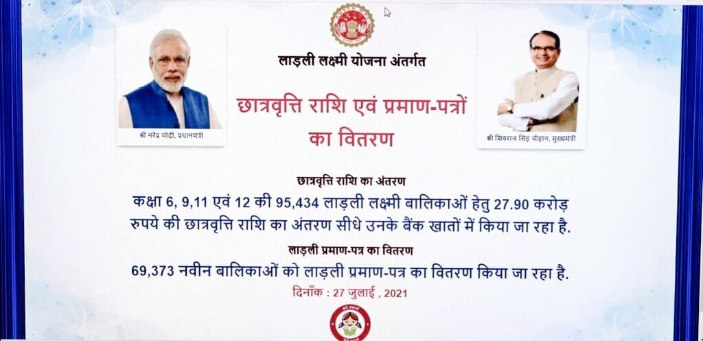 भोपाल, डेस्क रिपोर्ट। मंगलवार को लाडली लक्ष्मी योजना के तहत कक्षा 6वीं, 9वीं व 12वीं की 95 हजार 434 बेटियों के खातों में 27.90 करोड़ रुपये की छात्रवृत्ति राशि का अंतरण कर किया गया। इसी के साथ 69,373 नई बालिकाओं को लाडली लक्ष्मी प्रमाण पत्र का वर्चुअल वितरण किया गया। इस अवसर पर सीएम शिवराज सिंह चौहान ने कहा कि “आज मेरा मन बहुत खुशी और आनंद से भरा हुआ है, क्योंकि आज मैंने लाडली लक्ष्मी बेटियों से बात कर ली। मैं सबसे ज्यादा प्रसन्न एवं आनंदित तब होता हूं, जब बच्चों, विशेषकर बेटियों के बीच होता हूं! एक जमाना था कि हर माता-पिता चाहते थे कि उनके घर बेटे का जन्म हो, क्योंकि बेटे को बुढ़ापे का सहारा मानते थे। तब से ही मैं चाहता था कि बेटी बोझ न लगे, बल्कि वरदान बन जाये। मुख्यमंत्री बनते ही मैंने मुख्यमंत्री कन्या विवाह और लाडली लक्ष्मी योजना बनाई।”