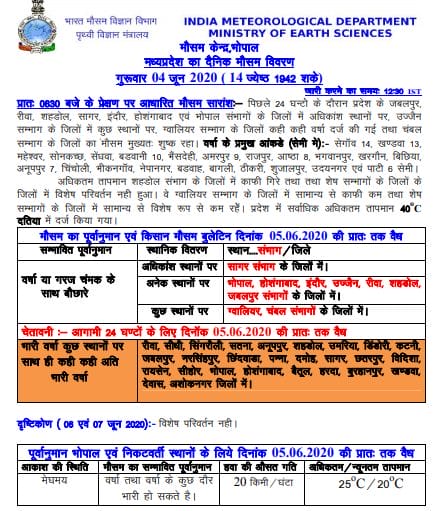 मौसम विभाग (Weather Department) की मानें तो अभी निसर्ग के कारण 2 से 3 दिन तक प्रदेश में बारिश का सिलसिला जारी रह सकता है| इसके बाद निसर्ग के कमजोर होने की संभावना है| विभाग ने बुधवार को ही प्रदेश के 18 जिलों में जोरदार बारिश की चेतावनी जारी की थी, जिसमें राजधानी भोपाल भी शामिल था। अब 27 जिलों में ऑरेंज अलर्ट जारी करते हुए अति वर्षा की चेतावनी दी है|