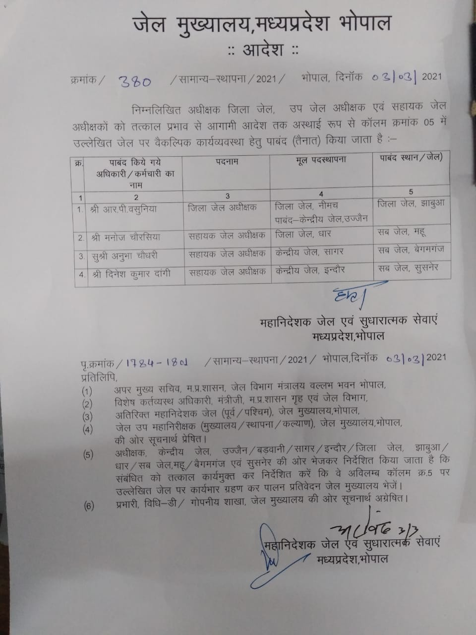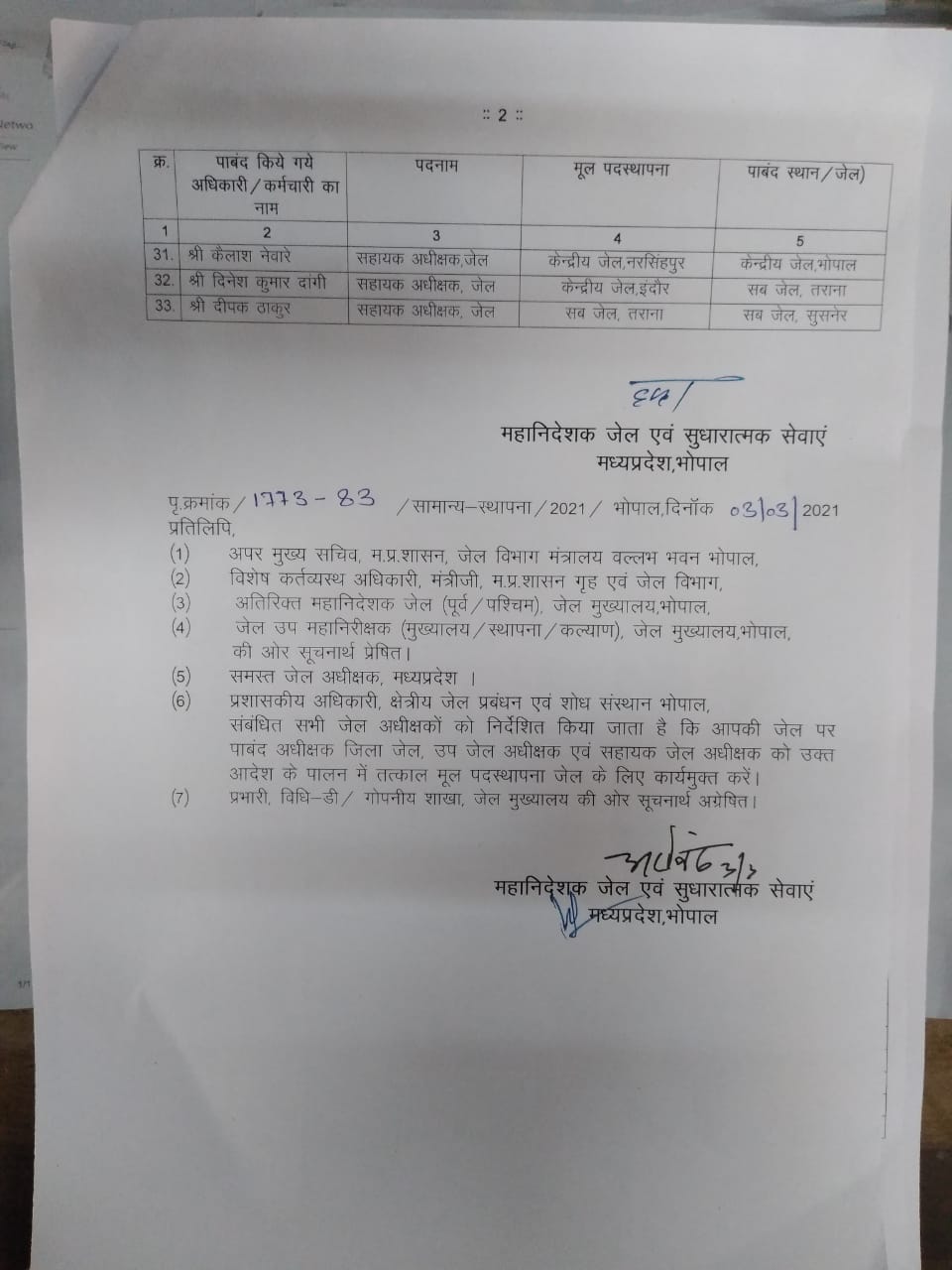 खास बात तो ये है कि जेल महानिदेशक अरविंद कुमार के हस्ताक्षर से जारी 33 लोगों की सूची में कुलवंत सिंह धुर्वे नाम के जिला जेल अधीक्षक भी शामिल है जो शराब पीकर बस स्टैंड पर गिरे होने के गंभीर आरोप के दोषी हैं और कलेक्टर की रिपोर्ट पर उन्हें भी अटैच किया गया था। संतोष कुमार गणेशे नाम के उप अधीक्षक जेल की मंडला जेल(Mandla Jail) में पदस्थापना के समय दो कैदी भाग गए थे जिसके बाद उन्हें भी अटैच किया गया था लेकिन उन्हें एक बार फिर जिला जेल में पदस्थ कर दिया गया है।