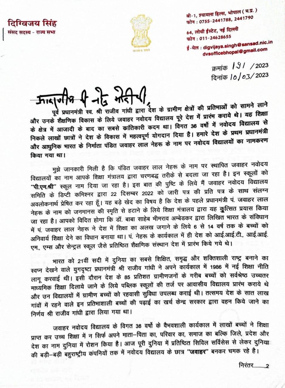 ‘मुझे जानकारी मिली है कि पंडित जवाहर लाल नेहरू के नाम पर स्थापित जवाहर नवोदय विद्यालयों का नाम आपके शिक्षा मंत्रालय द्वारा चरणबद्ध तरीके से बदला जा रहा है। इन स्कूलों को पी.एम.श्री स्कूल नाम दिया जा रहा है। इस बात की पुष्टि के लिये मैं जवाहर नवोदय विद्यालय समिति के डिप्टी कमिश्नर द्वारा 22 दिसम्बर 2022 को जारी पत्र की प्रति पत्र के साथ संलग्न अवलोकनार्थ प्रेषित कर रहा हूँ। यह बड़े खेद का विषय है कि देश के पहले प्रधानमंत्री पं. जवाहर लाल नेहरू के नाम को जनमानस की स्मृति से हटाने के लिये शिक्षा मंत्रालय द्वारा यह कृत्सित प्रयास किया जा रहा है। आपको विदित होगा कि डॉ. बाबा साहेब भीमराव अम्बेडकर द्वारा लिखित भारत के संविधान में पं. जवाहर लाल नेहरू ने देश में शिक्षा की अलख जगाने के लिये 6 से 14 वर्ष तक के बच्चों को अनिवार्य शिक्षा देने का विधान बनाया था। पं. नेहरू के कार्यकाल में ही देश को आई.आई.टी., आई.आई.एम., एम्स और सेन्ट्रल स्कूल जैसे प्रतिष्ठित शैक्षणिक संस्थान देश में प्रारंभ किये गये थे।’