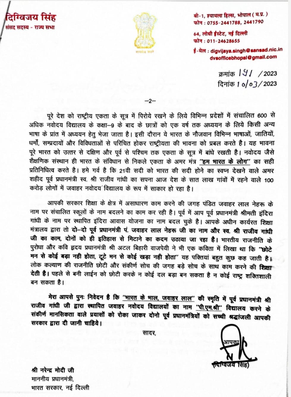 दिग्विजय सिंह ने अपने पत्र में लिखा है कि ‘पूर्व प्रधानमंत्री स्व. श्री राजीव गांधी द्वारा देश के ग्रामीण क्षेत्रों की प्रतिभाओं को सामने लाने और उनके शैक्षणिक विकास के लिये जवाहर नवोदय विद्यालय पूरे देश में प्रारंभ कराये थे। यह शिक्षा के क्षेत्र में आजादी के बाद का सबसे क्रांतिकारी कदम था। विगत 36 वर्षो में नवोदय विद्यालय से निकले लाखों छात्रों ने देश के विकास में महत्वपूर्ण योगदान दिया है। हमारे देश के प्रथम प्रधानमंत्री और आधुनिक भारत के निर्माता पंडित जवाहर लाल नेहरू के नाम पर नवोदय विद्यालयों का नामकरण किया गया था।’