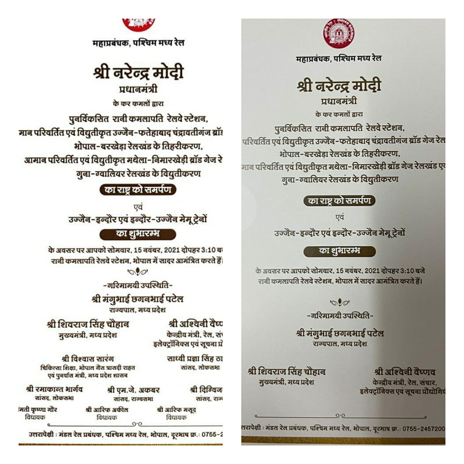 दरअसल रेलवे की तरफ से रानी कमलापति रेलवे स्टेशन के लोकार्पण के आमंत्रण कार्ड में प्रधानमंत्री, राज्यपाल, मुख्यमंत्री, केन्द्रीय रेलवे मंत्री सहित पूर्व मुख्यमंत्री और राज्यसभा सांसद दिग्विजय सिंह और कांग्रेस के दो विधायकों के नाम भी शामिल थे। लेकिन रेलवे ने ये कार्ड बांटने के बाद फिर उसमें बदलाव किया और आमंत्रण कार्ड से दिग्विजय सिंह और कांग्रेस के दो विधायकों के नाम हटा दिए गए। कहा जा रहा है कि ये बदलाव भाजपा संगठन की आपत्ति के बाद किया गया। जानकारी के मुताबिक केन्द्रीय रेल मंत्री द्वार भी रेलवे के अधिकारियों को फटकार लगाई गई और इसके बाद कई लोगों को आमंत्रण कार्ड बंट जाने के बावजूद उसमें से कांग्रेसी नेताओं के नाम हटाकर उसे दोबारा बांटा गया।