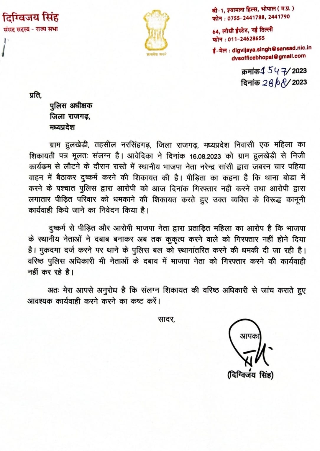 ‘दुष्कर्म से पीड़ित और आरोपी भाजपा नेता द्वारा प्रताड़ित महिला का आरोप है कि भाजपा के स्थानीय नेताओं ने दबाव बनाकर अब तक कुकृत्य करने वाले को गिरफ्तार नहीं होने दिया है। मुकदमा दर्ज करने पर थाने के पुलिस बल को स्थानांतरित करने की धमकी दी जा रही है। वरिष्ठ पुलिस अधिकारी भी नेताओं के दबाव में भाजपा नेता को गिरफ्तार करने की कार्यवाही नहीं कर रहे है। अतः मेरा आपसे अनुरोध है कि संलग्न शिकायत की वरिष्ठ अधिकारी से जांच कराते हुए आवश्यक कार्यवाही करने करने का कष्ट करें।’ इस मामले में पीड़ता का कहना है कि बीजेपी नेता और उसके लोग उसपर दबाव बना रहे हैं। अब दिग्विजय सिंह ने मामले में हस्तक्षेप करते हुए कार्रवाई को लेकर एसपी को पत्र लिखा है।