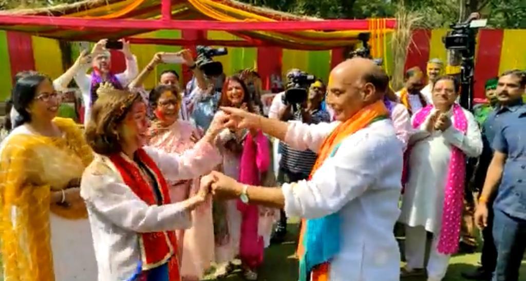 US Commerce Secretary Dance with Rajnath Singh : पूरा देश होली के जश्न में डूबा है। हर तरफ रंग है, धूम है, मस्ती है। आम लोगों के साथ सेलेब्ल, बॉलीवुड और सियासी गलियारों से भी होली की रंगारंग तस्वीरें सामने आ रही हैं। इसी क्रम में राजधानी दिल्ली में रक्षा मंत्री और वरिष्ठ बीजेपी नेता राजनाथ सिंह के आवास पर भी होली उत्सव का आयोजन कियागया। यहां पर अमेरिका की वाणिज्य सचिव जीना रायमोंडो भी शामिल हुईं और उन्होने इस त्योहार के खूब मज़े भी लिए।