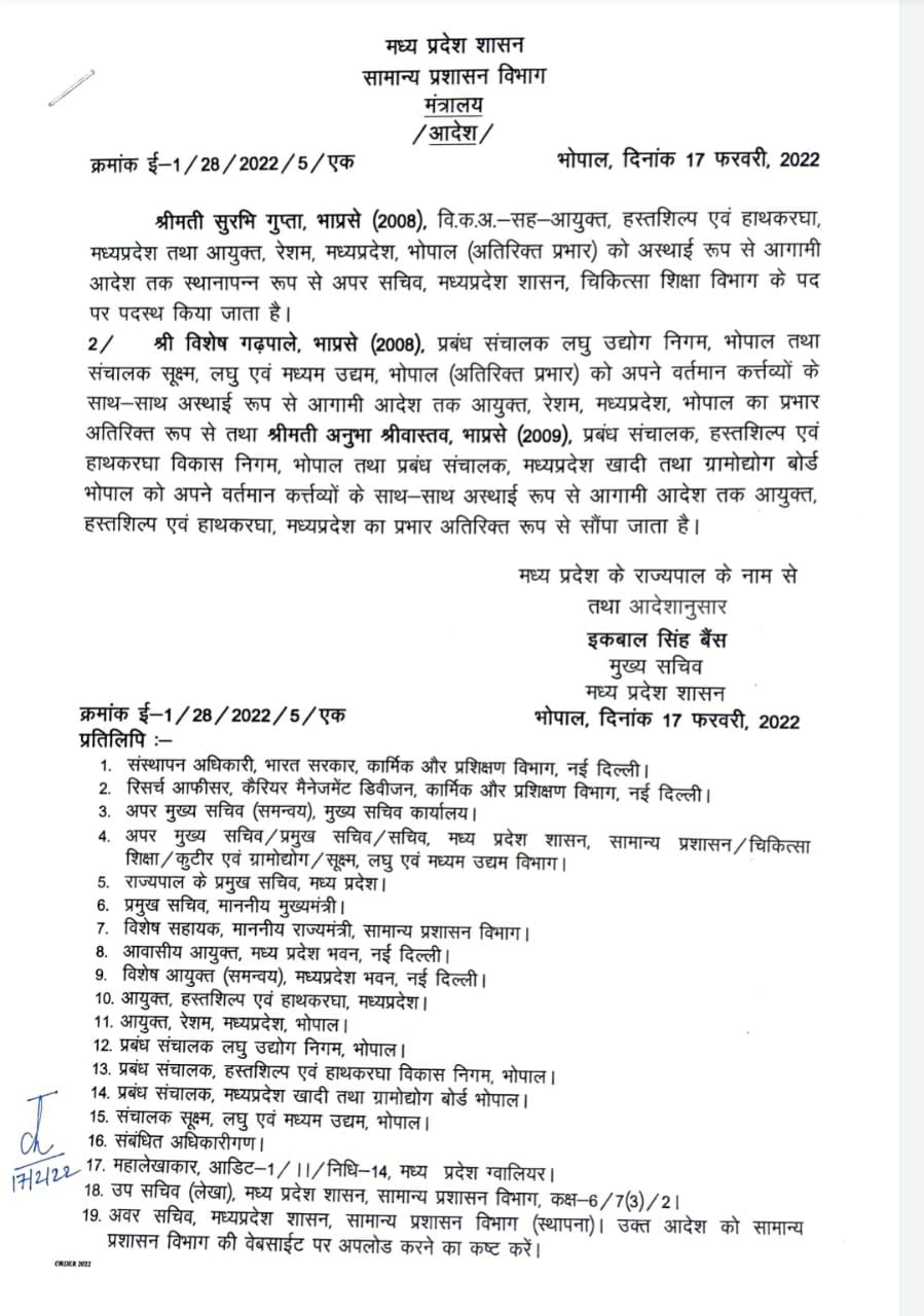 सामान्य प्रशासन विभाग द्वारा जारी आदेश के मुताबिक विशेष गढ़पाले, प्रबंध संचालक लघु उद्योग निगम तथा संचालक सूक्ष्म, लघु एवं मध्यम उद्यम को अपने वर्तमान कर्त्तव्यों के साथ आयुक्त रेश्म का प्रभार अतिरिक्त रूप से सौंपा है। साथ ही सुरभि गुप्ता, आयुक्त हस्तशिल्प हथकरघा और रेश्म को अपर सचिव चिकित्सा शिक्षा में नवीन पदस्थापना दी गई है।