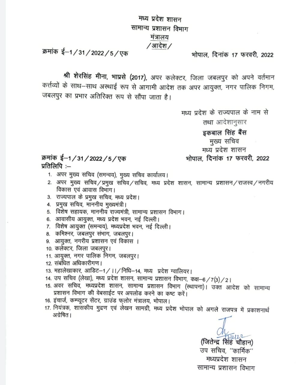 वहीँ शेरसिंह मीना अपर कलेक्टर ,जबलपुर को अपने कर्त्तव्यों के साथ आयुक्त नगर पालिका निगम जबलपुर का अतिरिक्त दायित्व सौंपा गया है। अनुभा श्रीवास्तव प्रबंध संचालक हस्तशिल्प एवं हथकरघा विकास निगम तथा प्रबंध संचालक मध्यप्रदेश खादी तथा ग्रामोद्योग बोर्ड अपने वर्तमान कर्त्तव्यों के साथ आयुक्त हस्तशिल्प एवं हथकरघा का अतिरिक्त दायित्व सौपा गया हैं।