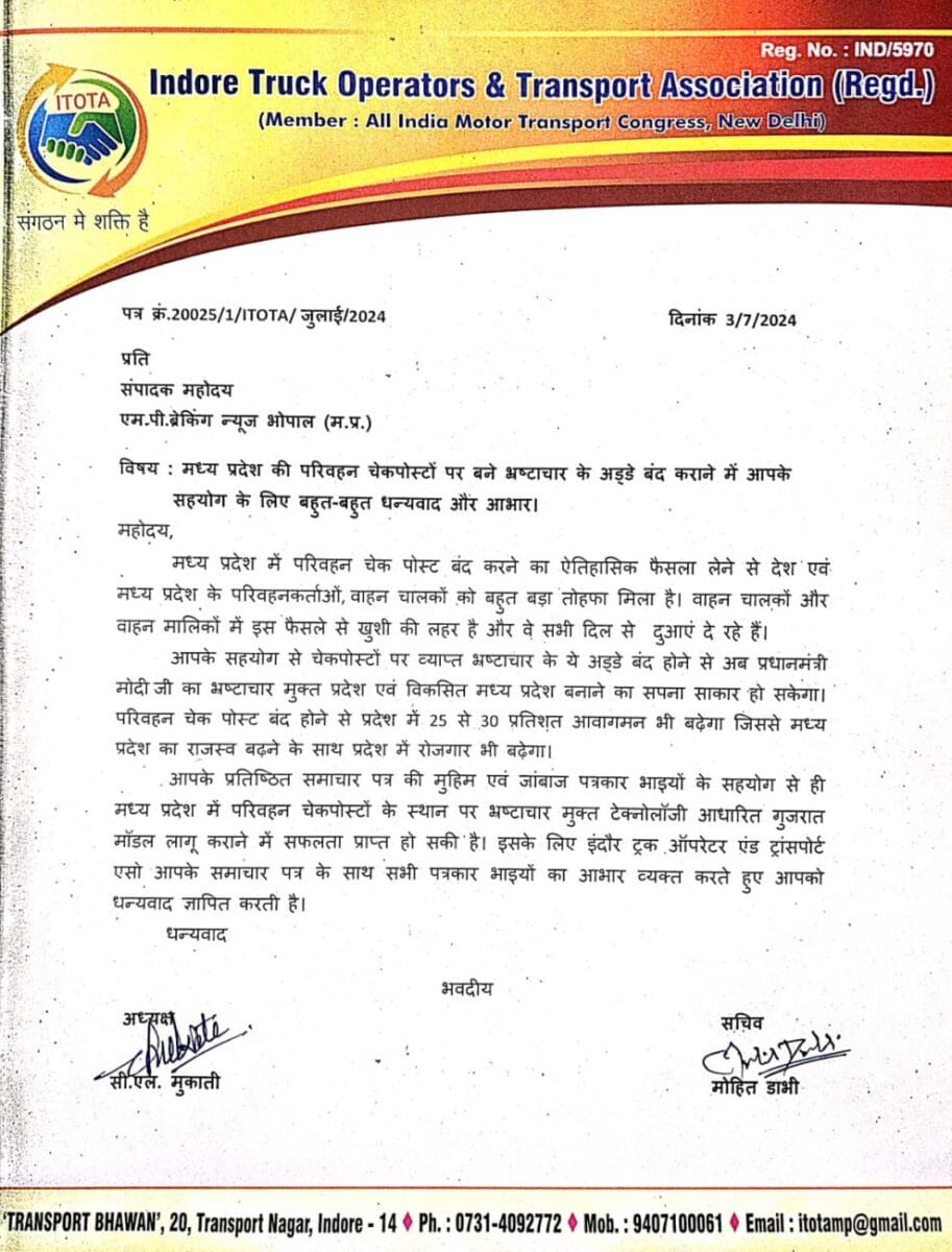 इसके बाद इंदौर ट्रक ऑपरेटर एंड ट्रांसपोर्ट एसोसिएशन ने एमपी ब्रेकिंग न्यूज़ को पत्र लिखकर धन्यवाद ज्ञापित किया है। इस पत्र में उन्होंने लिखा है कि ‘मध्य प्रदेश में परिवहन चेकपोस्ट बंद करने का ऐतिहासिक फैसला लेने से एमपी और देश के परिवहनकर्ताओं और वाहन चालकों को बड़ा तोहफ़ा मिला है। वाहन चालकों और मालिकों में इस फैसले से खुशी की लहर है और वे सभी दिल से दुआएँ दे रहे हैं। आपके प्रतिष्ठित समाचार पत्र की मुहिम और जाँबाज़ पत्रकार भाइयों के सहयोग से ही मध्य प्रदेश में परिवहन चेकपोस्ट के स्थान पर भ्रष्टाचार मुक्त टेक्नॉलॉजी आधारित गुजरात मॉडल लागू कराने में सफलता मिली है। इसके लिए इंदौर ट्रक ऑपरेटर एंड ट्रांसपोर्ट एसोसिएशन आपके समाचार पत्र के सभी पत्रकार भाइयों का आभार व्यक्त करते हुए आपको धन्यवाद ज्ञापित करता है।’ ट्रक ऑपरेटर एंड ट्रांसपोर्ट एसोसिएशन का ये पत्र एक बार फिर इस बात की पुष्टि करता है कि एमपी ब्रेकिंग न्यूज़ सदैव ईमानदार पत्रकारिता के लिए प्रतिबद्ध है। इस तरह की सराहना हमें फिर-फिर याद दिलाती है कि हम पूरी सच्चाई के साथ मुद्दों को उठाते आए हैं और आगे भी ये सिलसिला बरकरार रहेगा।