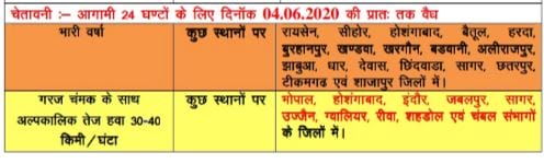 विभाग की माने तो गुजरात और महाराष्ट्र के तटीय इलाकों से होते हुए निसर्ग तूफान मध्य प्रदेश (Madhya Pradesh) में पहुंचेगा. इस तूफान का असर 5 जून तक रहेगा।उन्होंने कहा कि 3, 4 और 5 जून को इंदौर, उज्जैन संभाग के 15 जिलों के अलावा भोपाल में भी भारी बारिश हो सकती है। कुछ जगहों पर 50 से 60 किमी प्रति घंटे की रफ्तार से हवाएं भी चलने की संभावनाएं हैं।गुरुवार को ज्यादा बारिश की संभावना है। शुक्रवार तक चक्रवात का असर कमजोर होने लगेगा, इसलिए बारिश भी कम होने की उम्मीद है। विभाग ने बुधवार-गुरुवार को अधिकांश स्थानों पर तेज हवा के साथ भारी वर्षा की चेतावनी जारी की है।