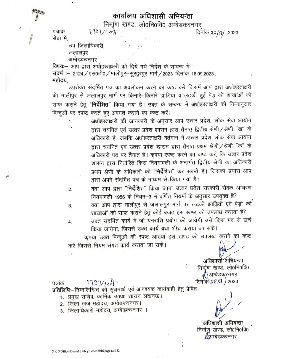 मामला है उत्तर प्रदेश का। यहां अंबेडकर नगर जिले के जलालपुर में उप जिलाधिकारी यानी एसडीएम ने पीडब्ल्यूडी के अधिशासी अभियंता यानी एग्जीक्यूटिव इंजीनियर को एक पत्र लिखा। इस पत्र में लिखा गया है कि ‘तहसील जलालपुर जनपद अंबेडकरनगर क्षेत्रान्तर्गत मालीपुर से जलालपुर सड़क मार्ग पर किनारे किनारे झाड़ियां व पेड़ की शाखाएं लटकी हुई है जिसके कारण उक्त मार्ग पर दुर्घटना की प्रबल संभावना है। उक्त के दृष्टिगत आपको निर्देशित किया जाता है कि सड़क किनारे लटकी हुई झाड़ियों पर पेड़ की शाखाओं को साफ कराना सुनिश्चित करें।’ कुल मिलाकर एसडीएम ने लोक निर्माण विभाग के इंजीनियर को कहा कि अमुक सड़क किनारे लगी झाड़ियां हटा दी जाए। लेकिन मामले ने तो कुछ और ही रुख ले लिया।