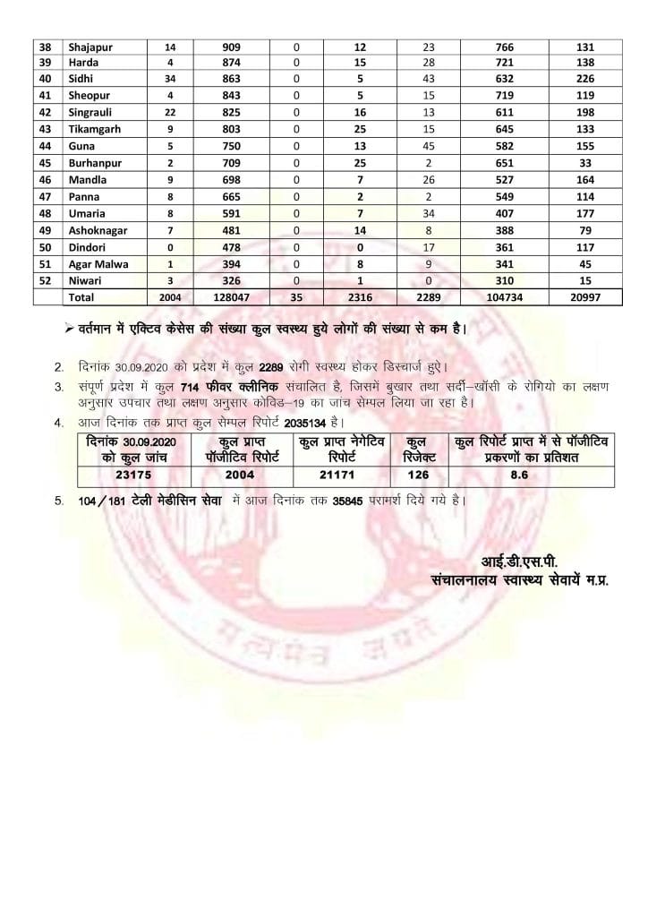 संचालनालय स्वास्थ्य सेवाएं, मध्य प्रदेश द्वारा जारी कोरोनावायरस मीडिया बुलेटिन के मुताबिक पिछले 24 घंटे में 23175 सैंपल की जांच की गई। जिसमे से 126 सैंपल रिजेक्ट हो गए। वहीं 21171 सैंपल नेगेटिव और 2004 सैंपल पॉजिटिव पाए गए। इन्हे मिलकर अब तक प्रदेश में 128047 लोग कोरोना के शिकार हो चुके हैं| हालाँकि राहत की बात है कि पिछले 24 घंटे में 2289 स्वस्थ हुए हैं, इस तरह अब तक कुल 104734 लोग कोरोना से जंग जीत चुके हैं|