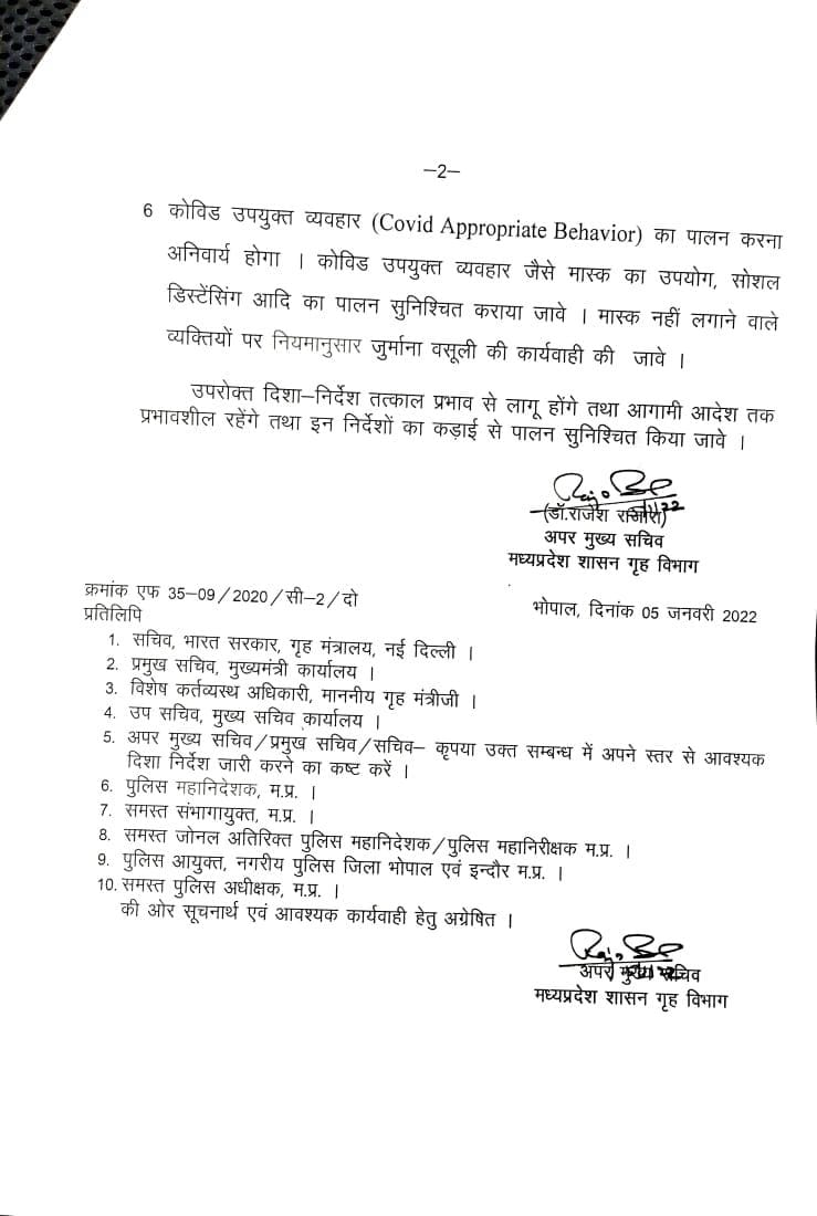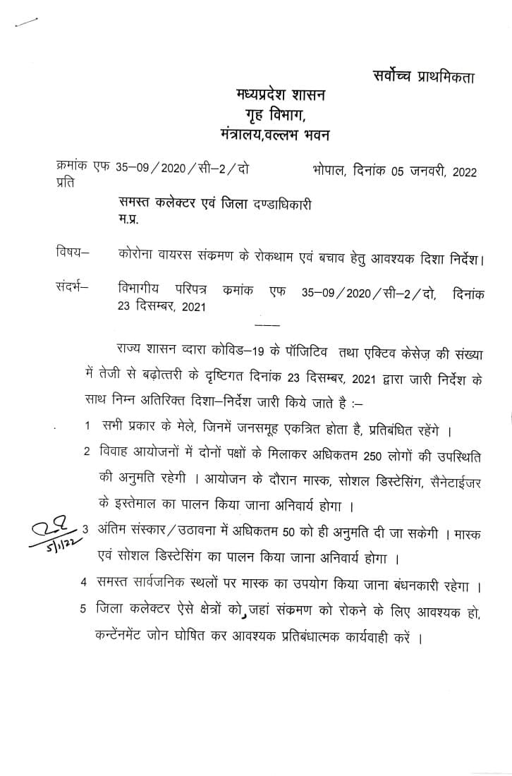 इसके अलावा शव यात्रा में केवल 50 लोग ही शामिल हो सकेंगे। वही लंबे वक्त के बाद खुले स्कूलों में स्टूडेंट्स की संख्या 50 प्रतिशत तक कर दी गई है। वही रात्रिकालीन कर्फ्यू का समय रात 11 बजे से सुबह 5 बजे तक रहेगा। फिलहाल, बेकाबू होते कोरोना की रफ्तार को देखते हुए एम.पी.ब्रेकिंग न्यूज आपसे अपील करता है बहुत जरूरी हो तो ही घर से निकले और प्रशासन के सभी निर्देशों का पालन करे।