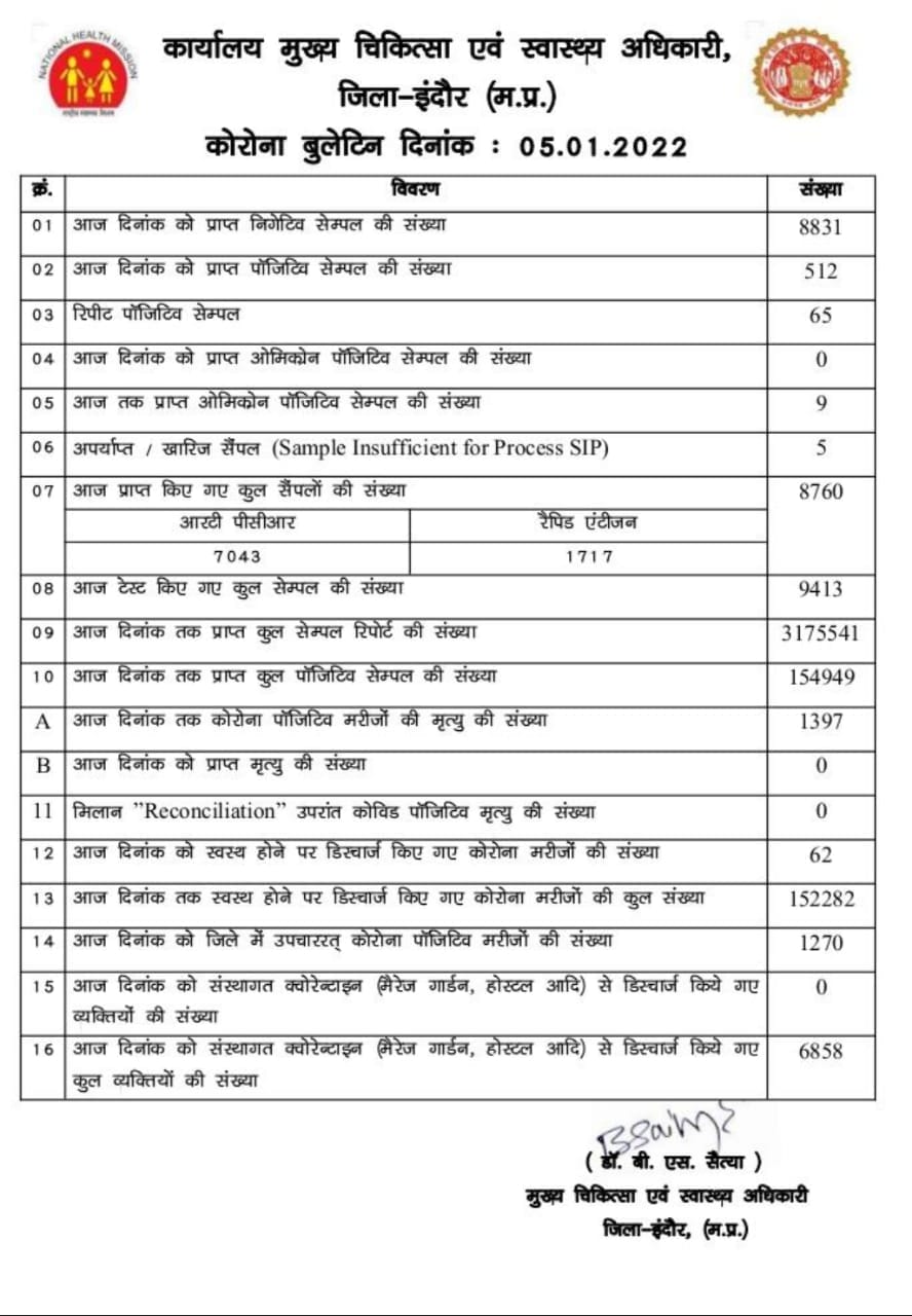 बुधवार रात को जारी की गई रिपोर्ट के हिसाब से इंदौर में कल 9413 सैम्पल की जांच की गई जिनमे से 512 लोग पॉजिटिव हुए है। होम आइसोलेशन और कोविड चिह्नित अस्पतालों में 1270 लोगो का इलाज चल रहा है। वही 62 मरीजो के स्वस्थ होने पर उन्हें डिस्चार्ज किया गया है।