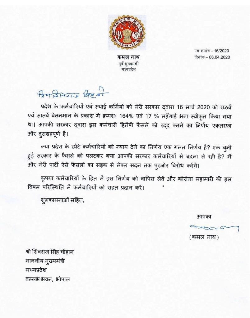 अपने पत्र में उन्होंने लिखा है कि मेरी सरकार द्वारा 16 मार्च 2020 को छठवें और सातवें वेतनमान के रूप में 164% और 17% महंगाई भत्ता स्वीकृत किया गया था लेकिन आप की सरकार द्वारा इस कर्मचारी हितैषी फैसले को रद्द करने का निर्णय एकतरफा और दुराग्रह पूर्ण है। कमलनाथ ने शिवराज से सवाल किया है कि क्या प्रदेश के छोटे कर्मचारियों को न्याय देने का निर्णय गलत निर्णय है और एक चुनी हुई सरकार के फैसले को पलट कर क्या आप की सरकार कर्मचारियों से बदला ले रही है। मैं और मेरी पार्टी ऐसे फैसलों का सड़क से लेकर सदन तक विरोध करेंगे । पत्र के आखिर में एक बार फिर कमलनाथ ने मुख्यमंत्री शिवराज सिंह चौहान से अनुरोध किया है कि वह कर्मचारियों के हित में निर्णय को वापस लें और कोरोना महामारी की इस विषम परिस्थितियों में कर्मचारियों को राहत प्रदान करें।हालाकि पहले ही शिवराज यह साफ कर चुके है कि मंहगाई भत्ता केवल स्थगित किया गया है,रद्द नहीं।