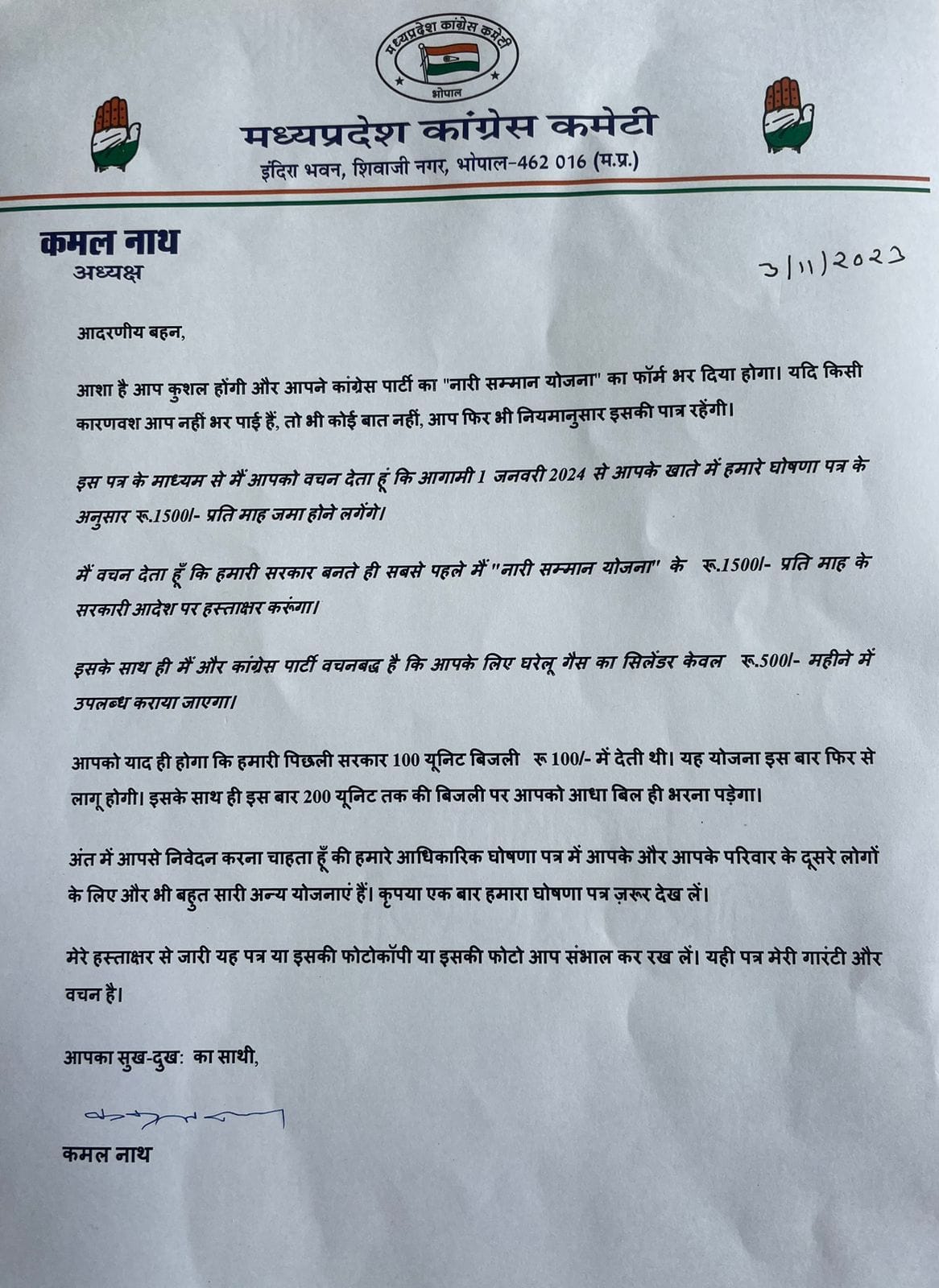 कमलनाथ ने अपने पत्र में कहा है कि मैं वचन देता हूं कि कांग्रेस सरकार बनते ही सबसे पहले नारी सम्मान योजना पर दस्तखत करुंगा और अगले साल एक जनवरी को महिलाओं के खाते में 1500 रुपए आ जाएंगे। इसी के साथ उन्होने कहा है कि घरेलू गैस सिलेंडर 500 रुपये में मिलने लगेगा। अगर अब तक किसी महिला ने नारी सम्मान योजना के फॉर्म नहीं भरे हैं, तो भी वो इस योजना के लिए पात्र होगी। पूर्व मुख्यमंत्री ने प्रत्येक घर को 100 यूनिट तक मुफ्त बिजली और 200 यूनिट तक आधी कीमत पर बिजली देने का वादा भी दोहराया। इसी के सााथ उन्होने महिलाओं से आग्रह किया कि वे 3 नवंबर 2023 में उनके दस्तखत से जारी इस पत्र को या इसकी फोटोकॉपी को सुरक्षित रख लें क्योंकि यह सिर्फ उनका पत्र नहीं है बल्कि उनकी गारंटी और वचन है।