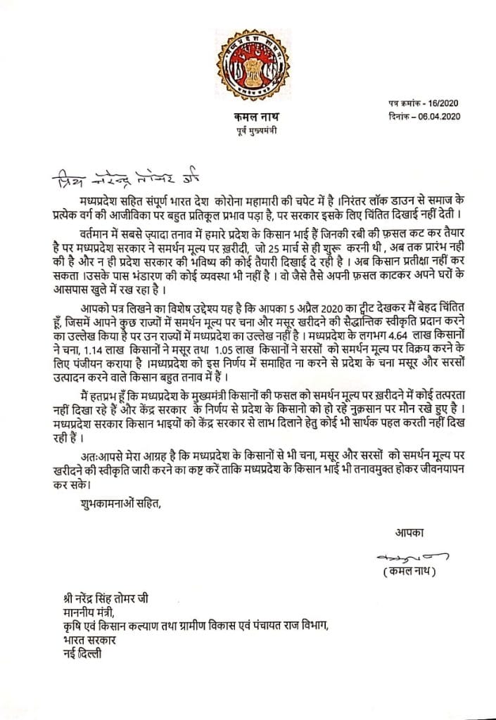 सत्ता से हटने के बाद से ही पूर्व मुख्यमंत्री कमलनाथ को किसानों की चिंता सता रही है ।एक के बाद एक मुख्यमंत्री शिवराज को पत्र लिखने के बाद अब कमलनाथ ने केंद्रीय कृषि मंत्री नरेन्द्र सिंह तोमर को पत्र लिखा है।इसमे उन्होंने किसान हित में मध्यप्रदेश में किसानो से चना , मसूर व सरसों को समर्थन मूल्य पर ख़रीदने की स्वीकृति देने की माँग की है।