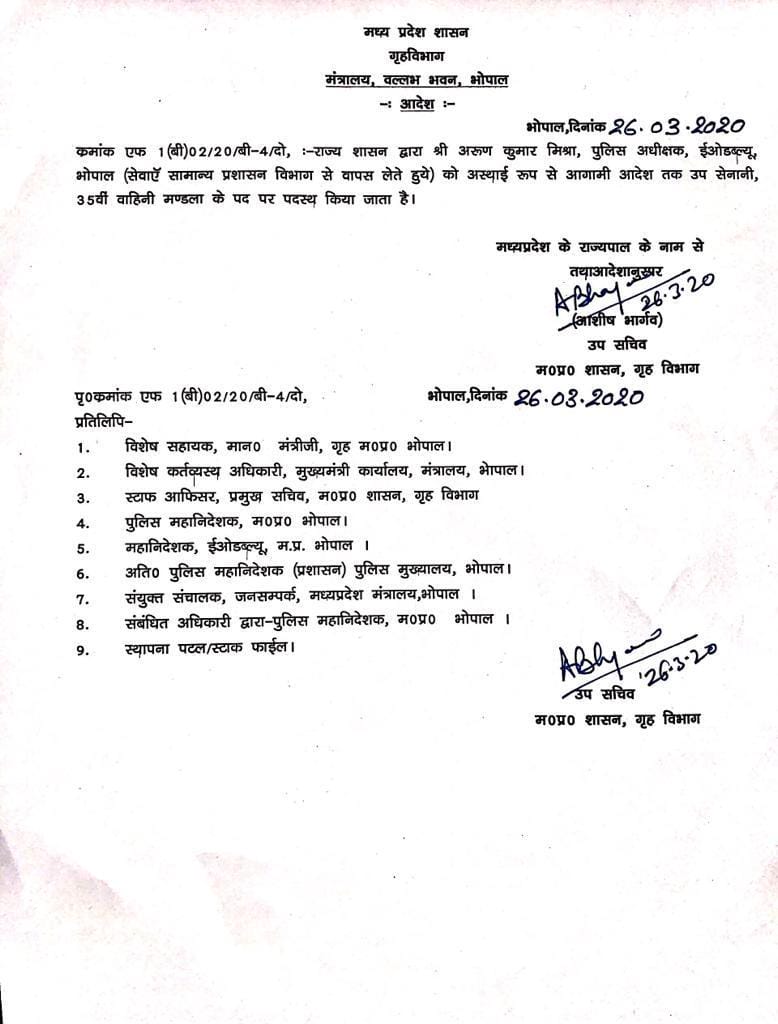 भोपाल। ज्योतिरादित्य सिंधिया के खिलाफ 2014 में खुले ईओडब्ल्यू के केस के मामले में ईओडब्ल्यू के भोपाल एसपी अरुण मिश्रा की छुट्टी कर दी गई है। शिवराज सरकार ने बेहद ताकतवर रहे अरुण मिश्रा कमलनाथ सरकार के आते ही कमलनाथ के बेहद नजदीक हो गए थे और ई टेंडर मामले को लेकर उन्होंने पूर्व मंत्री नरोत्तम मिश्रा के विशेष सहायकों के खिलाफ मामला दर्ज किया था। इस पर विपक्ष ने आरोप लगाए थे कि ईओडब्लू अब पुलिस का थाना हो गया है और पूरी तरह से सरकार के नियंत्रण में काम कर रहा है। इतना ही नहीं ,जैसे ही ज्योतिरादित्य सिंधिया ने कांग्रेस छोड़ भाजपा का दामन थामा, ईओडब्ल्यू ने उनके खिलाफ 2014 में बंद हो चुका जमीन घोटाले का मामला एक बार पुनः जांच में ले लिया। हालांकि शिवराज सरकार के आते ही इस मामले में एक बार फिर फाइनल रिपोर्ट लगा दी गई लेकिन तब से ही कयास लगाए जा रहे थे कि अरुण मिश्रा की रवानगी तय है ।सरकार ने सिंगल आदेश जारी करके अरुण मिश्रा की पदस्थापना अब उप सेनानी,35 वी वाहनी,मंडला के पद पर की है जो लूप लाइन की पोस्ट मानी जाती है। इस बात के भी कयास लगाए जा रहे हैं कि जल्दी और डब्लू के प्रमुख सुशोभन बनर्जी को भी शिफ्ट किया जा सकता है।