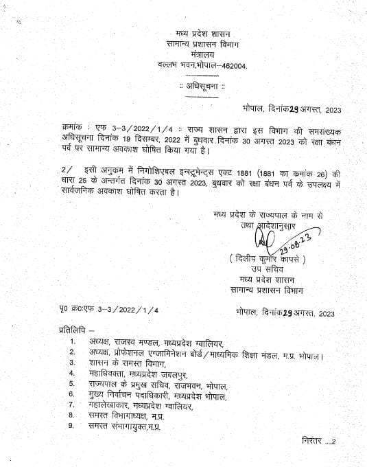 उप सचिव दिलीप कुमार कापसे की ओर से जारी आदेश में कहा गया है कि राज्य शासन द्वारा निगोशिएबल इन्स्ट्रेमेन्ट्रस एक्ट 1881 (1881 का क्रमांक 26) की धारा 25 के अंतर्गत दिनांक 30 अगस्त 2023, बुधवार को रक्षा बंधन पर्व के उपलक्ष्य में सार्वजनिक अवकाश घोषित किया जाता है।