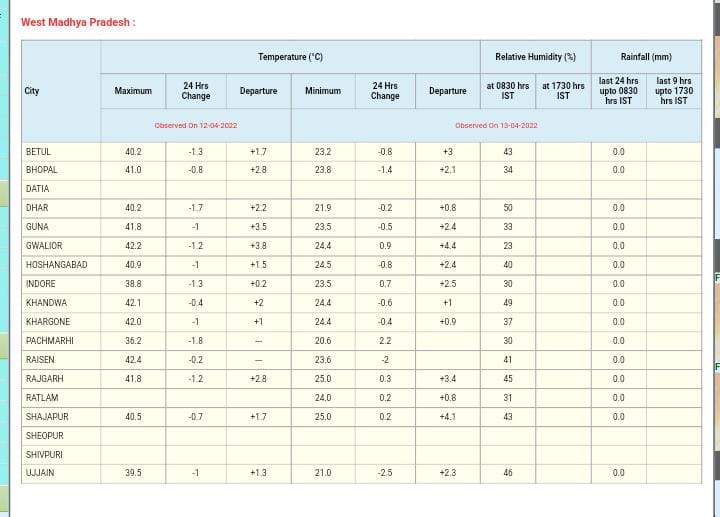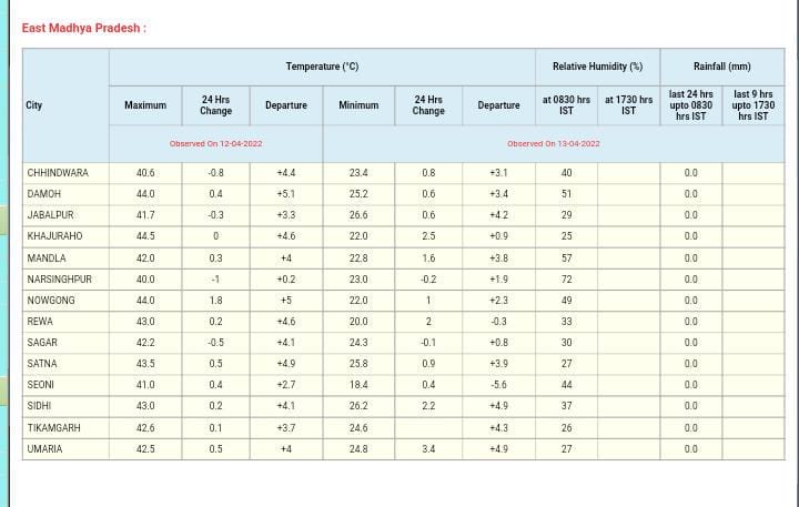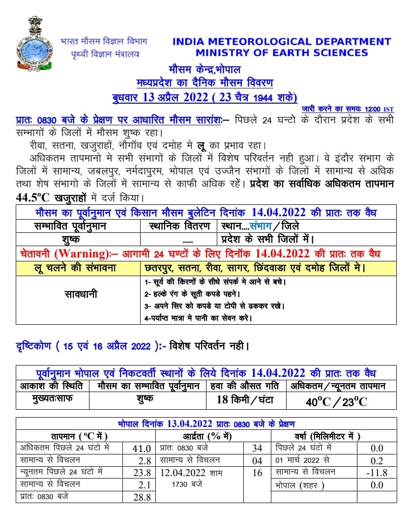 एमपी मौसम विभाग (MP Weather Report) के अनुसार, आज 13 अप्रैल 2022 को छतरपुर, सतना, रीवा, सागर, छिंदवाड़ा और दमोह जिलों में लू का येलो अलर्ट जारी किया गया है।पिछले 24 घंटे में सबसे अधिकतम तापमान 44.5 डिग्री सेल्सियस खजुराहो में दर्ज किया गया है ।पिछले 24 घंटे में सभी जिले शुष्क रहे लेकिन रीवा, सतना, नौगांव,खजुराहो और दमोह लू का असर रहा।