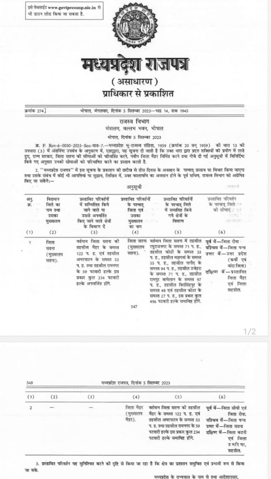 MP News : विधानसभा चुनाव से पहले मुख्यमंत्री शिवराज सिंह चौहान ने आज मंगलवार की सुबह माँ शारदा की नगरी मैहर को जिला बनाने की घोषणा की और इस घोषणा के कुछ घंटों बाद ही इसका गजट नोटिफिकेशन जारी हो गया, नोटिफिकेशन में सतना जिले से काटकर अलग मैहर जिला बनाने की पूरी जानकारी दी गई और एक महीने में दावे आपत्ति मांगी गई है, अब मैहर के जिला बन जाने से मध्य प्रदेश में जिलों की संख्या बढ़कर 55 हो गई है।