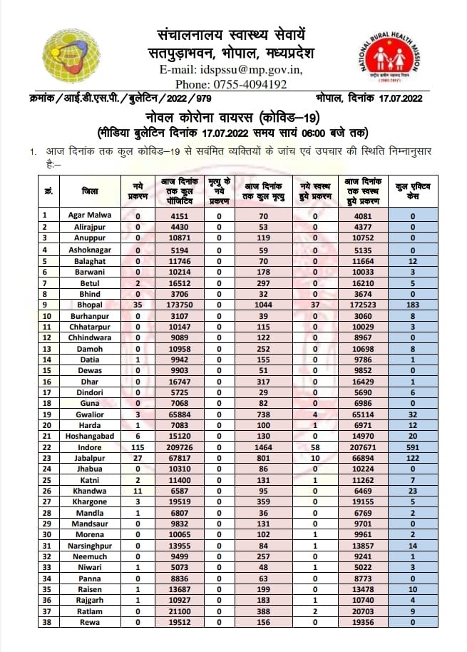 स्वास्थ्य विभाग द्वारा जारी बुलेटिन के अनुसार, रविवार को प्रदेशभर में 7,247 सेम्पलों की जांच में 218 पॉजिटिव और 7,029 सेम्पल निगेटिव पाए गए, जबकि 63 सेम्पल रिजेक्ट हुए। संक्रमण की दर 3.0 रही। नये मामलों में इंदौर में 115, भोपाल में 35, जबलपुर में 27, खंडवा में 11, नर्मदापुरम में 6, सीहोर में 5, ग्वालियर और खरगोन में 3-3, बैतूल और कटनी में 2-2 तथा दतिया, हरदा, मंडला, निवाड़ी, रायसेन, राजगढ़, सागर, शिवपुरी और सिंगरौली में 1-1 नये संक्रमित मिले।इसके साथ ही 33 जिलों में कोरोना के नये मामले शून्य रहे और कोरोना से कोई मौत नहीं हुई।