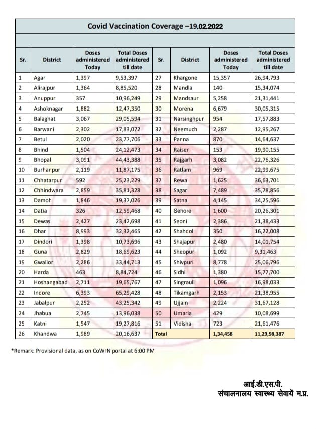 आज 19 फरवरी 2022 को आई स्वास्थ्य विभाग की रिपोर्ट के अनुसार, शुक्रवार को 68 हजार 926 टेस्ट किए गए, जिसमें शनिवार को 24 घंटे में 1013 नए पॉजिटिव केस मिले हैं।इसमें प्रदेश में भोपाल में 261, इंदौर 74, जबलपुर 43, सिवनी 40, नरसिंहपुर 37, रायसेन 32, सागर 31, धार 26, बालाघाट 25, सीहोर 25, शिवपुरी 23, देवास 22, होशंगाबाद 22, छतरपुर 21, विदिशा 21, छिंदवाड़ा 20, कटनी 20 बाकी अन्य जिलों से मिले है। वही 2 की मौत विदिशा और उज्जैन में 1-1 मौत दर्ज की गई है।