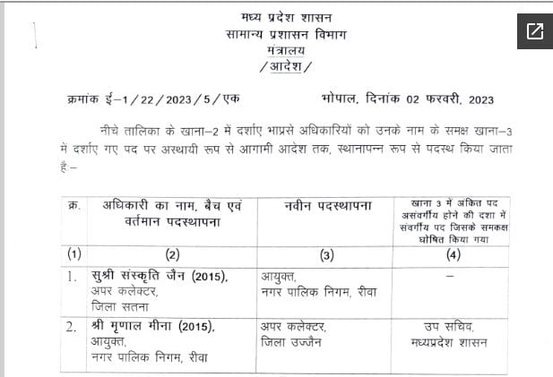 राज्य शासन ने भारतीय प्रशासनिक सेवा के 2 अधिकारियों की नवीन पद-स्थापना की है। सुश्री संस्कृति जैन अपर कलेक्टर सतना को आयुक्त नगरपालिक निगम रीवा और मृणाल मीना आयुक्त नगरपालिक निगम रीवा को अपर कलेक्टर जिला उज्जैन पदस्थ किया है।सामान्य प्रशासन विभाग ने इस आशय के आदेश जारी कर दिये हैं।