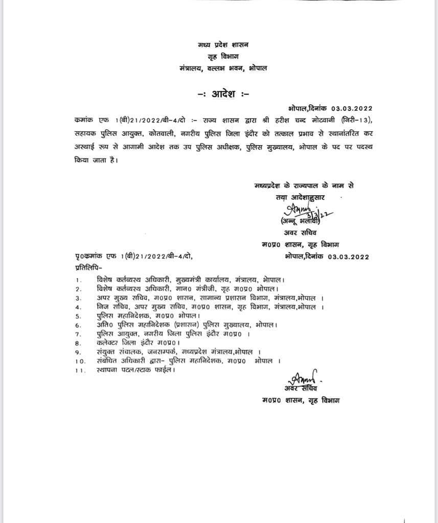 भोपाल, डेस्क रिपोर्ट। मध्यप्रदेश में तबादलों (MP Transfer) का दौर जारी है। एक बार फिर से गृह विभाग (home department) द्वारा आदेश जारी किए गए हैं। जिसके मुताबिक राज्य शासन ने IPS Transfer में हरिश्चंद्र मोटवानी, सहायक पुलिस आयुक्त को तत्काल प्रभाव से उप पुलिस अधीक्षक, पुलिस मुख्यालय, भोपाल के पद पर पदस्थ कर दिया गया है।