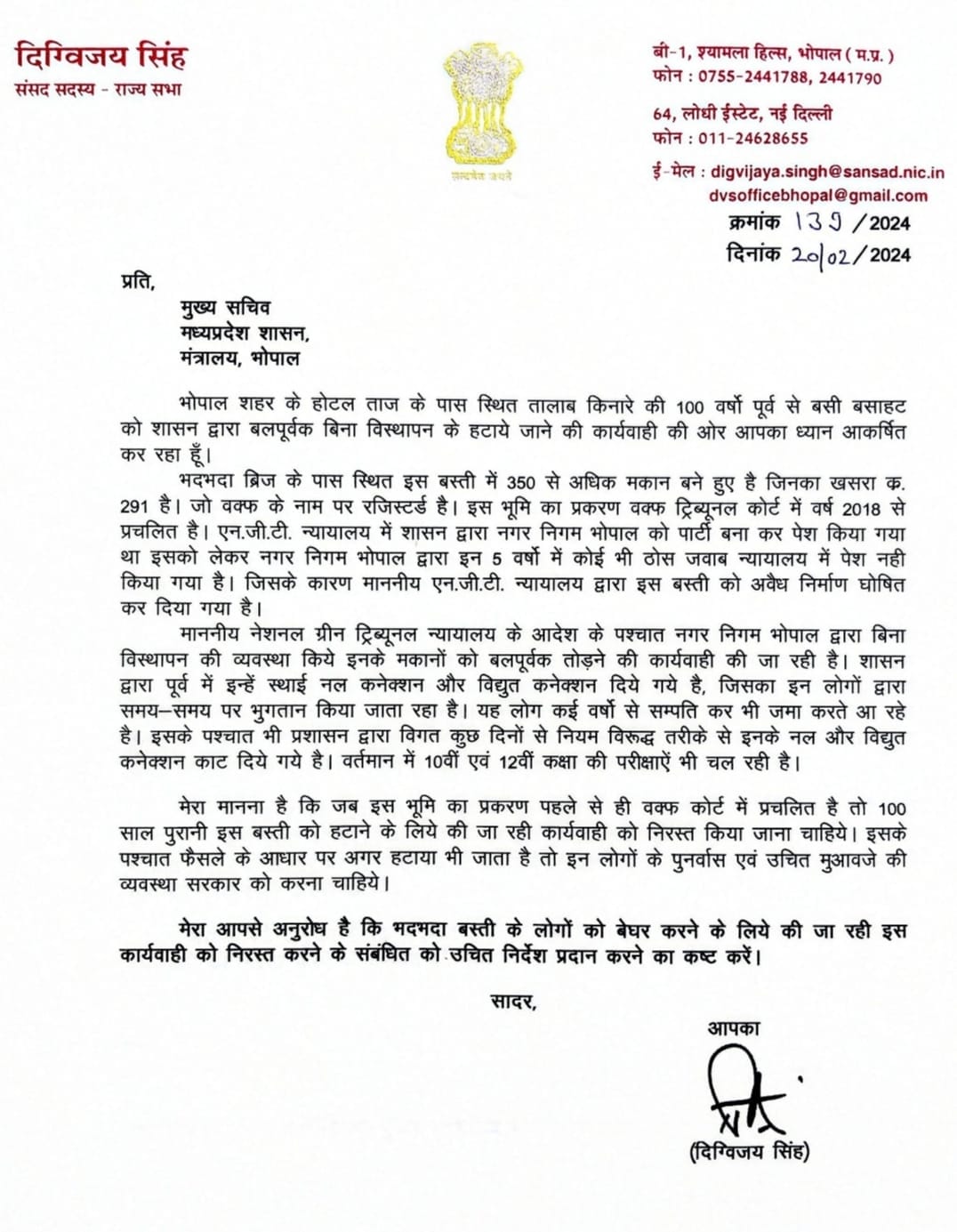 मुख्य सचिव, मध्यप्रदेश शासन को लिखे पत्र में दिग्विजय सिंह ने कहा है कि ‘भोपाल शहर के होटल ताज के पास स्थित तालाब किनारे की 100 वर्षो पूर्व से बसी बसाहट को शासन द्वारा बलपूर्वक बिना विस्थापन के हटाये जाने की कार्यवाही की ओर आपका ध्यान आकर्षित कर रहा हूँ। भदभदा ब्रिज के पास स्थित इस बस्ती में 350 से अधिक मकान बने हुए है जिनका खसरा क्र. 291 है। जो वक्फ के नाम पर रजिस्टर्ड है। इस भूमि का प्रकरण वक्फ ट्रिब्यूनल कोर्ट में वर्ष 2018 से प्रचलित है। एन.जी.टी. न्यायालय में शासन द्वारा नगर निगम भोपाल को पार्टी बना कर पेश किया गया था इसको लेकर नगर निगम भोपाल द्वारा इन 5 वर्षो में कोई भी ठोस जवाब न्यायालय में पेश नही किया गया है। जिसके कारण माननीय एन.जी.टी. न्यायालय द्वारा इस बस्ती को अवैध निर्माण घोषित कर दिया गया है।’