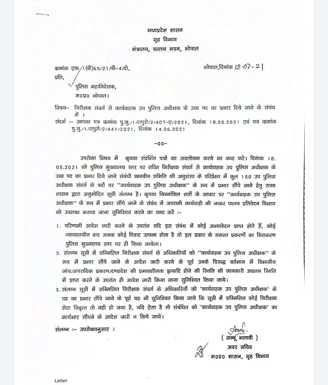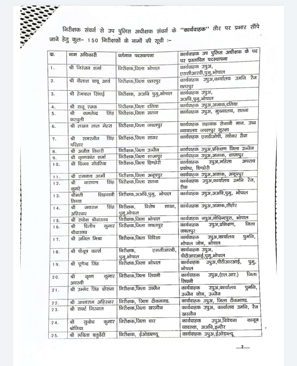भोपाल, डेस्क रिपोर्ट। निकाय चुनावों (Urban Body Election) से पहले मध्यप्रदेश (Madhya Pradesh) में पुलिसकर्मियों (MP POLICE) को प्रमोशन (Promotion) देने का सिलसिला जारी है। इसी कड़ी में एक बार फिर थोकबंद पुलिसकर्मियों को प्रमोशन दिया गया है।आज सोमवार को जारी आदेश के अनुसार, इसमें 150 टीआई को कार्यवाहक डीएसपी (DSP) का प्रभार दिया गया है।