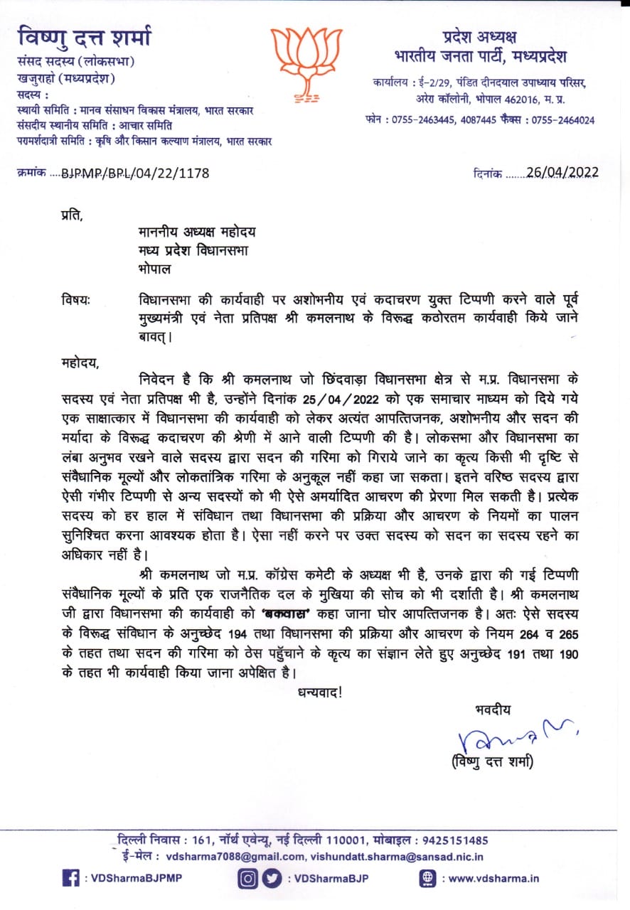 लिखे पत्र में विधानसभा अध्यक्ष से कार्रवाई की मांग करते हुए वीडी शर्मा ने कहा कि कमलनाथ द्वारा छिंदवाड़ा विधानसभा क्षेत्र 25 अप्रैल 2022 को समाचार माध्यम से दिए गए एक साक्षात्कार में विधानसभा की कार्रवाई को लेकर आपत्तिजनक अशोभनीय और सदन की मर्यादा के विरुद्ध कदाचार श्रेणी में आने वाली टिप्पणी की थी। लोकसभा और विधानसभा का लंबा अनुभव रखने के बाद भी सदस्य द्वारा सदन की गरिमा को गिराए जाने का यह कृत्य किसी भी दृष्टि में संवैधानिक मूल्य और लोकतांत्रिक गरिमा के अनुकूल नहीं कहा जा सकता है।