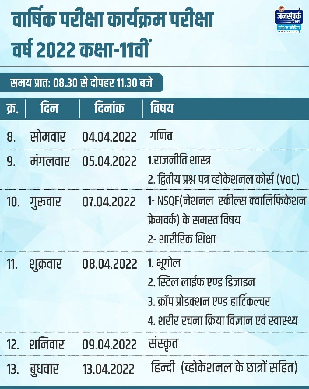 कक्षा 11वीं का वार्षिक परीक्षा का कार्यक्रम घोषित