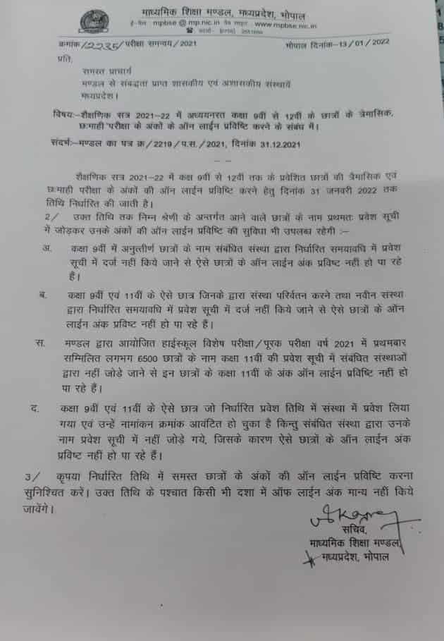 दरअसल शैक्षणिक सत्र 2021-22 में MP Board 9वीं से 12वीं तक के छात्रों की त्रैमासिक, छमाही परीक्षा के अंकों की ऑनलाइन प्रविष्टि की जा रही है। इसके लिए माध्यमिक शिक्षा मंडल की तरफ से 15 जनवरी 2022 तक का समय स्कूलों को दिया गया था। हालांकि कई स्कूल 15 जनवरी तक त्रैमासिक, छमाही अंकों की प्रविष्टि करने में असफल रहे थे। जिसके बाद माध्यमिक शिक्षा मंडल ने आदेश जारी करते हुए तिथि को बढ़ाकर 31 जनवरी 2022 कर दिया है।