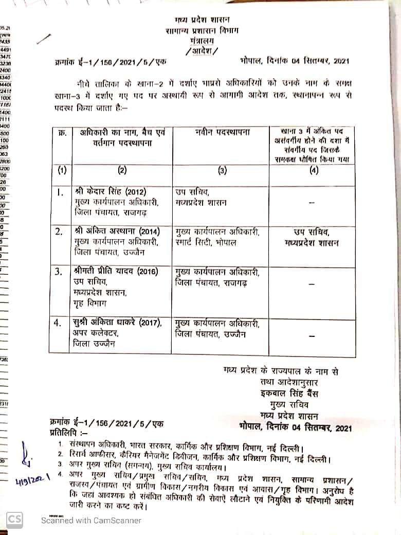 भोपाल, डेस्क रिपोर्ट। मध्य प्रदेश (MP) में तबादलों (transfer) का दौर जारी है। एक बार फिर राज्य शासन (MP Government) ने आईएएस अधिकारियों के तबादलें (IAS transfer) किए है। इस संबंध में समान्य प्रशासन द्वारा सूची जारी की गई है।इसमें 4 IAS अधिकारियों को इधर से उधर किया गया है।