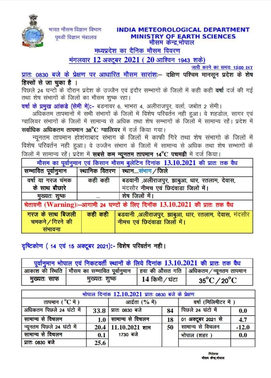 मौसम विभाग (MP Weather Update) की मानें आज 12 अक्टूबर 2021 को बड़वानी, अलीराजपुर,झाबुआ, धार, रतलाम, देवास, मंदसौर, नीमच और छिंदवाड़ा में बारिश की संभावना है। वही इन सभी जिलों में बिजली चमकने और गिरने के चलते येलो अलर्ट जारी किया गया है।इधर, वेदर सिस्टम और हवाओं के रुख बदलने के चलते पूरे हफ्ते कहीं कहीं बारिश के आसार है।ग्वालियर-चंबल समेत 41 जिलों से मानसून पूरी तरह से विदा हो चुका है, लेकिन अन्य राज्यों से नमी मिलने के चलते कहीं कहीं बारिश हो रही है।