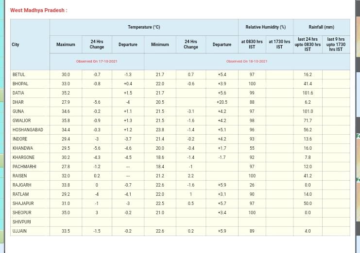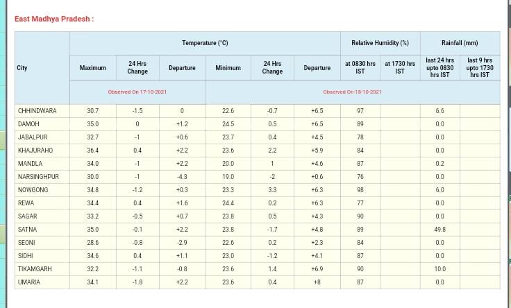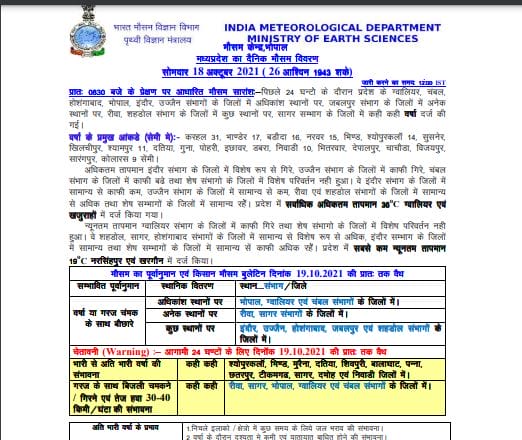 मौसम विभाग (MP Weather Forecast) का पूर्वानुमान है कि आज 18 अक्टूबर 2021 को श्योपुर, भिंड, मुरैना, दतिया, बालाघाट,पन्ना, छतरपुर, टीकमगढ़, शिवपुरी, सागर, दमोह और निवाड़ी जिले में भारी बारिश की संभावना है। वही रीवा, सागर, ग्वालियर, भोपाल, चंबल संभागों में कई स्थानों पर बारिश के साथ बिजली गिरने और चमकने के चलते येलो अलर्ट जारी किया गया है। वही 30-40 किमी की रफ्तार से हवा चलने की संभावना है।इसके अलावा सभी संभागों में बारिश के आसार है।