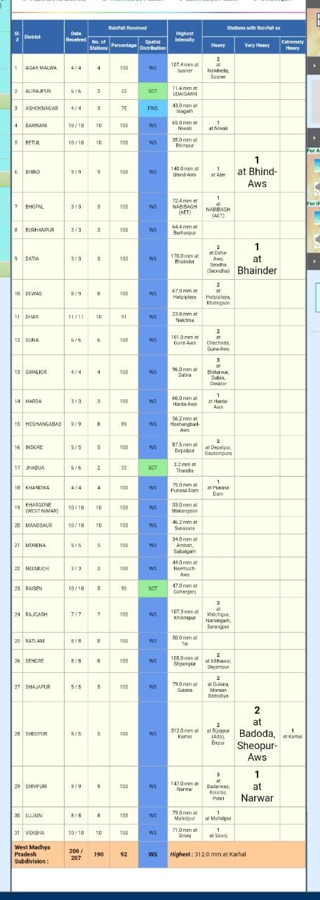 पिछले 24 घंटे की बात करें तो श्योपुर जिले में 24 घंटे में 12 इंच से ज्यादा की बारिश हुई है।इसके बाद गुना और दतिया में 4-4 इंच के साथ होशंगाबाद, बुरहानपुर और ग्वालियर में 2 से लेकर 3 इंच तक बारिश हुई है। वही अचानक हुई इस भारी बारिश से श्योपुर, गुना, रायसेन, बैतूल दतिया, विदिशा में फसलों को भारी नुकसान पहुंचा है।भोपाल में ट्रैफिक जाम तो बुरहानपुर में बहादरपुर रोड पर नाले का पानी आने से मध्यप्रदेश-महाराष्ट्र से संपर्क टूट गया।हालांकि बुंदेलखंड और महाकौशल और विंध्य के इलाकों में कम बारिश हुई।