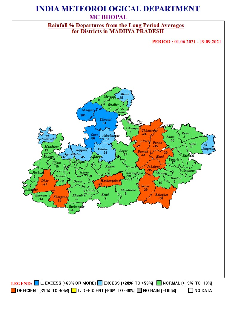 भोपाल, डेस्क रिपोर्ट। मध्य प्रदेश के लिए राहत की खबर है, प्रदेश में पूरे महिने झमाझम बारिश का दौर जारी रहने वाला है। इसका कारण बंगाल की खाड़ी में एक और कम दबाव का क्षेत्र बनने से आज रविवार 19 सितंबर 2021 से बारिश की गतिविधियाें में तेजी आने के आसार है।वही महीने के आखिरी सप्ताह यानि 25 सितंबर काे भी बंगाल की खाड़ी में एक नया कम दबाव का क्षेत्र बनने जा रहा है, जिसके प्रभाव से सितंबर माह के अंत तक मूसलाधार का सिलसिला जारी रहेगा । मौसम विभाग (MP Weather Department) ने आज रविवार को भी 3 जिलों में भारी बारिश (Heavy rain) और सभी संभागों में रिमझिम बारिश की संभावना जताई है।