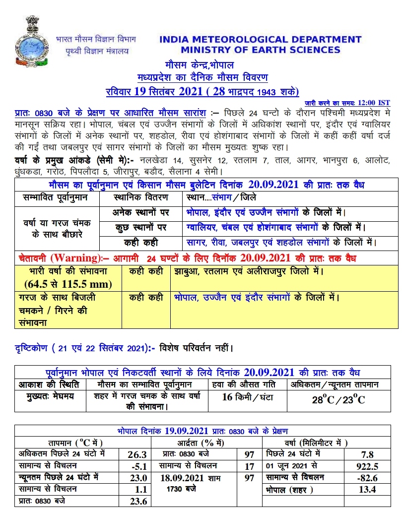 मौसम विभाग (MP Weather Forecast) की मानें तो आज रविवार 19 सितंबर 2021 को प्रदेश के 3 जिलों झाबुआ, रतलाम और अलीराजपुर में भारी बारिश (Heavy Rain) की चेतावनी जारी की है।वही 3 संभागों भोपाल, इंदौर और उज्जैन में बिजली गिरने और चमकने की संभावना को देखते हुए येलो अलर्ट जारी किया गया है।वही सभी संभागों के जिलों में कही कही बौछार के आसार है। वही एक-दो दिन में एक और सिस्टम और 25 सितंबर को दूसरे सिस्टम बनने की संभावना है इससे पहले पिछले 24 घंटे में एक दर्जन से ज्यादा जिलों में बारिश देखने को मिली।