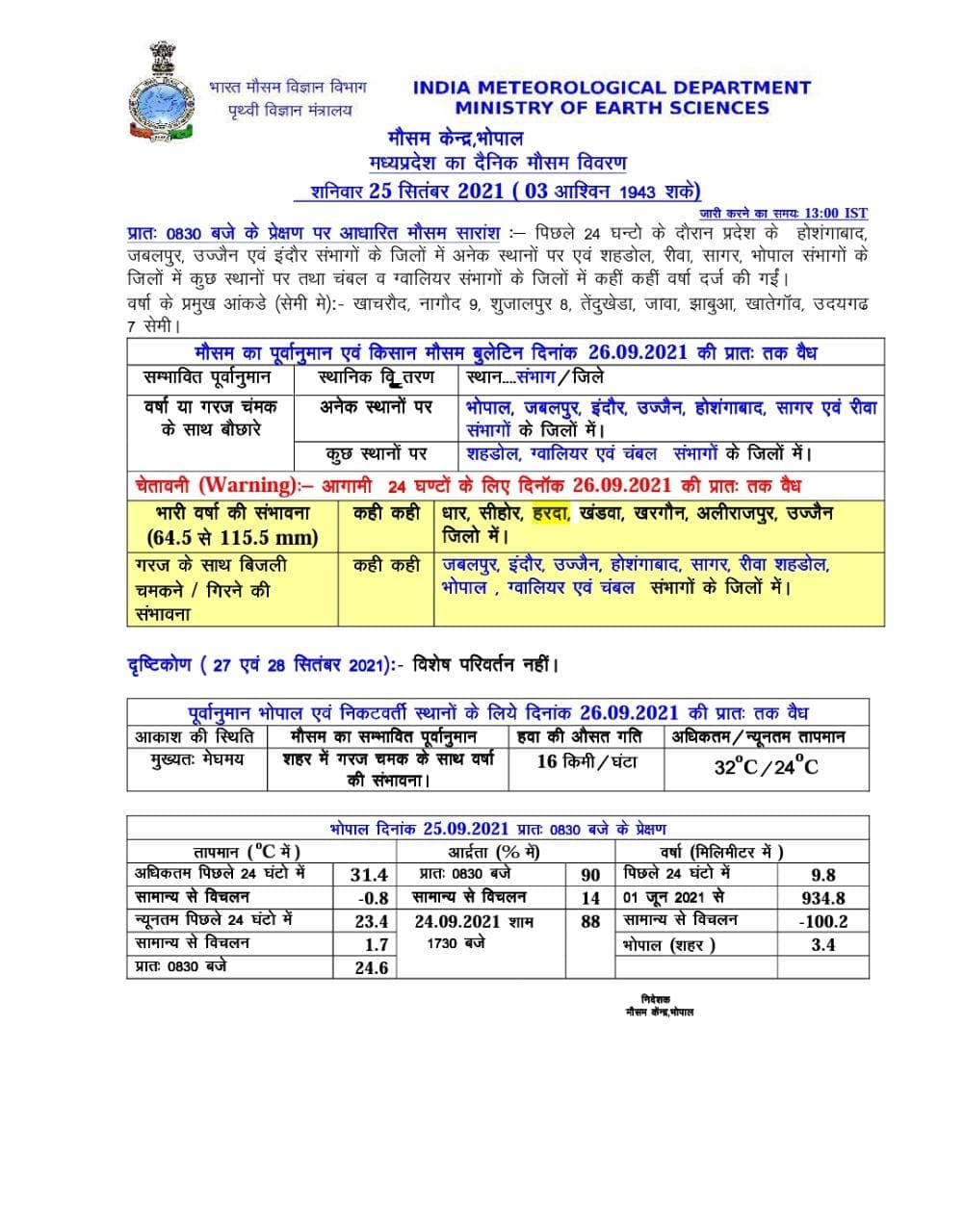 मौसम विभाग (MP Weather alert) ने आज शनिवार 25 सितंबर 2021 को प्रदेश के 7 जिलों धार, सीहोर, हरदा, खंडवा, खरगोन, अलीराजपुर, उज्जैन जिलों में भारी बारिश (Heavy Rain) की चेतावनी जारी की गई है। वही भोपाल, उज्जैन, जबलपुर, सागर, रीवा, होशंगाबाद, ग्वालियर, चंबल, इंदौर, शहडोल संभागों में बिजली गिरने और चमकने की संभावना को देखते हुए येलो अलर्ट जारी किया गया है। वही भोपाल, उज्जैन, जबलपुर, सागर, रीवा, होशंगाबाद, इंदौर संभागों के जिलों में अनेक स्थानों पर शहडोल, ग्वालियर और चंबल में कही कही बारिश के आसार है।