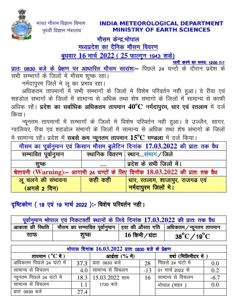 भोपाल, डेस्क रिपोर्ट। गुजरात-राजस्थान की तरफ से आ रही गर्म पश्चिमी हवाओं के चलते मध्य प्रदेश (MP Weather Update Today 16 March 2022) में भी गर्मी का असर तेज हो गया है। होली के पहले कई जिलों में तापमान 40 डिग्री तक पहुंच गया है, आने वाले दिनों में सूर्य के तेवर और सख्त होने वाले है। एमपी मौसम विभाग (MP Weather Department) ने आज 16 मार्च 2022 बुधवार को सभी जिलों में मौसम के शुष्क रहने की संभावना जताई है लेकिन 5 जिलों में लू चलने के चलते येलो अलर्ट जारी किया गया है।