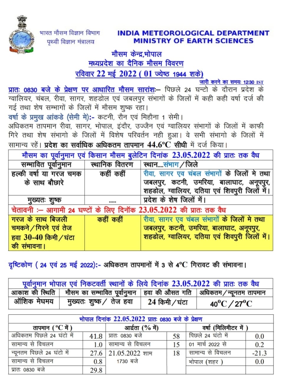 एमपी मौसम विभाग (MP Weather Forecast) के अनुसार, पिछले 24 घंटे में सीधी में 44.6 डिग्री सेल्सियस तापमान दर्ज किया गया। वही ग्वालियर, चम्बल, रीवा,सागर, शहडोल और जबलपुर संभागो के जिलों में हल्की बारिश हुई । आज रविवार 22 मई 2022 को 22 जिलों में गरज चमक के साथ बौछार के आसार है और गरज के साथ बिजली चमकने और तेज हवा 30/40 किमी प्रति घंटा चल सकती है। जम्मू कश्मीर में 22 मई को पश्चिमी विक्षोभ सक्रिय होने से 22 से 24 मई के बीच ग्वालियर में आंधी चलेगी और बादल छाएंगे, लेकिन पश्चिमी विक्षोभ के गुजर जाने के बाद 25 मई से तापमान बढ़ेगा और नौतपा शुरू हो जाएगा ।