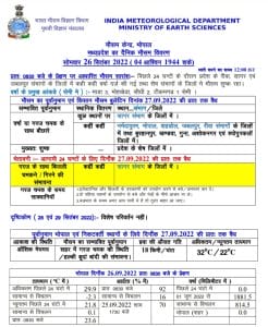 भोपाल, डेस्क रिपोर्ट।मध्य प्रदेश के मौसम में बदलाव का दौर जारी है। एमपी मौसम विभाग (Meteorological Department) ने आज सोमवार 26 सितंबर 2022 को 6 संभागों और 5 जिलों में बारिश की चेतावनी जारी की है।वही सागर संभाग में गरज चमक के साथ बिजली गिरने और चमकने की चेतावनी जारी की है।आज सोमवार को महाराष्ट्र और छत्तीसगढ़ से सटे कुछ इलाकों, बुंदेलखंड, बघेलखंड और महाकौशल के कुछ इलाकों में रिमझिम बारिश हो सकती है। प्रदेश के नर्मदापुरम, हरदा, भिंड, मुरैना और श्योपुरकलां में बूंदाबांदी होने की संभावना है।