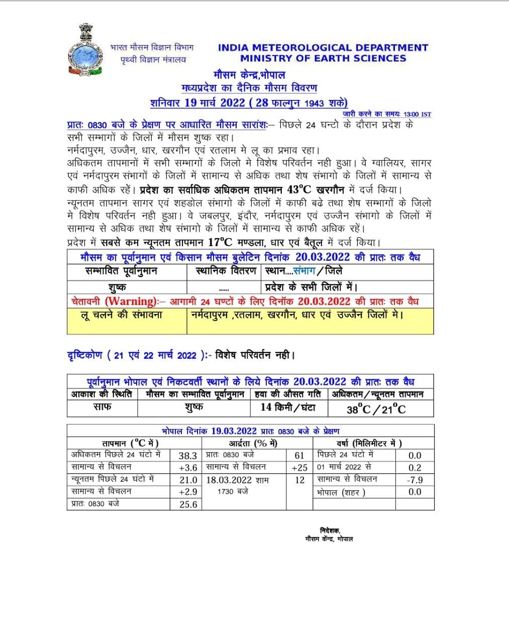 मौसम विभाग (MP Weather Report) के मुताबिक, आज 19 मार्च 2022 को नर्मदापुरम, धार, रतलाम, खरगोन और उज्जैन जिलों में लू चलने के चलते येलो अलर्ट जारी किया गया है। पिछले 24 घंटे में सभी जिलों में मौसम शुष्क रहा।सबसे न्यूनतम तापमान 17 डिग्री सेल्सियस मंडला, धार और बैतूल में दर्ज किया गया। वही सबसे अधिकतम तापमान खरगोन में 43 डिग्री सेल्सियस दर्ज किया गया।शनिवार को राजधानी भोपाल का न्यूनतम तापमान 21 डिग्री सेल्सियस दर्ज किया गया, जो सामान्य से 3 डिग्री सेल्सियस अधिक रहा। शुक्रवार के न्यूनतम तापमान 18.4 डिग्री सेल्सियस की तुलना में 2.6 डिग्री सेल्सियस अधिक रहा। शुक्रवार को भोपाल का अधिकतम तापमान 38.3 डिग्री सेल्सियस रिकार्ड किया गया था, जो सामान्य से 4 डिग्री सेल्सियस अधिक रहा था।