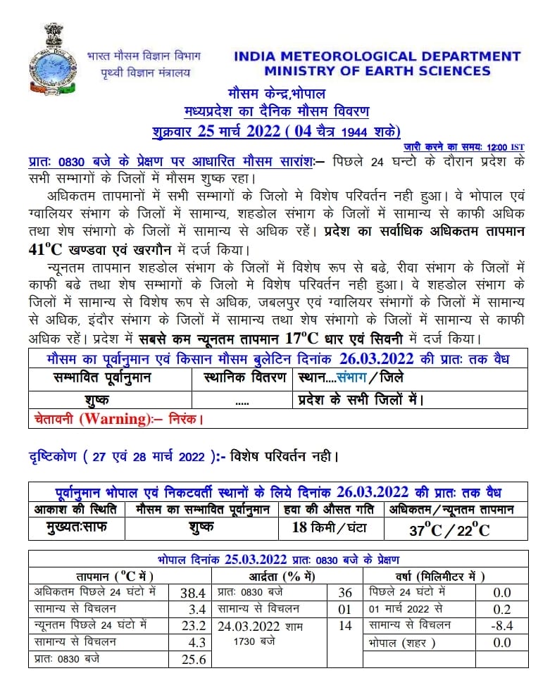आगामी दिनों में आने वाले पश्चिमी विक्षोभ के असर के कारण भी तापमान में उतार-चढ़ाव जारी रहेगा। पिछले 24 घंटे में सबसे अधिकतम 41.7 डिग्री सेल्सियस तापमान खंडवा और खरगोन में दर्ज किया गया।वही सबसे न्यूनतम तापमान 17 डिग्री सेल्सियस धार और सिवनी में दर्ज किया गया। अन्य जिलों में कोई विशेष परिवर्तन नहीं हुआ।अभी दो तीन दिन तक मौसम के ऐसे ही बने रहने के आसार है।