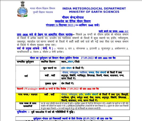 एमपी मौसम विभाग की मानें तो वर्तमान में प्रदेश से साइक्लोनिक सर्कुलेशन सिस्टम और दो ट्रफ लाइन गुजर रही है, इसके कारण नमी आ रही है और कहीं कहीं बारिश हो रही है। अगले 24 घंटे में भोपाल, इंदौर, उज्जैन समेत प्रदेश के अधिकांश जिलों में बादल छा सकते है, कहीं बूंदाबांदी तो कहीं तेज बारिश भी हो सकती है।वही 2 दिन बाद सक्रिय होने वाले सिस्टम का असर 28 सितंबर से 2 अक्टूबर देखने को मिलेगा।इसके असर से जबलपुर और ग्वालियर में हल्की बूंदाबांदी हो सकती है। वही अक्टूबर के पहले सप्ताह से मानसून की विदाई शुरू होने के आसार है।